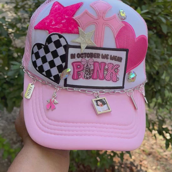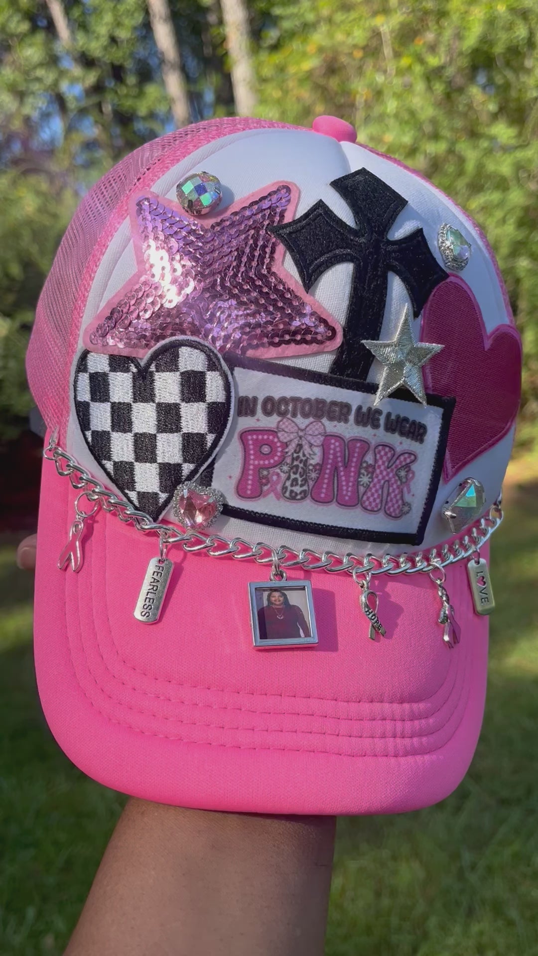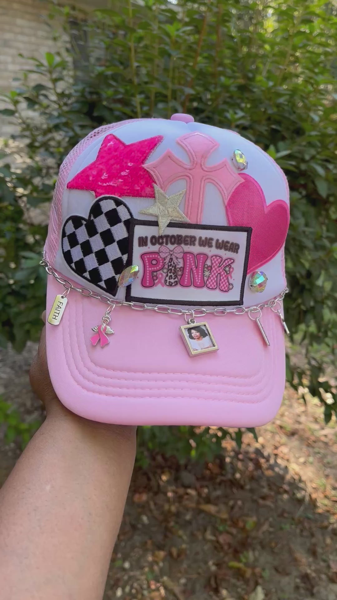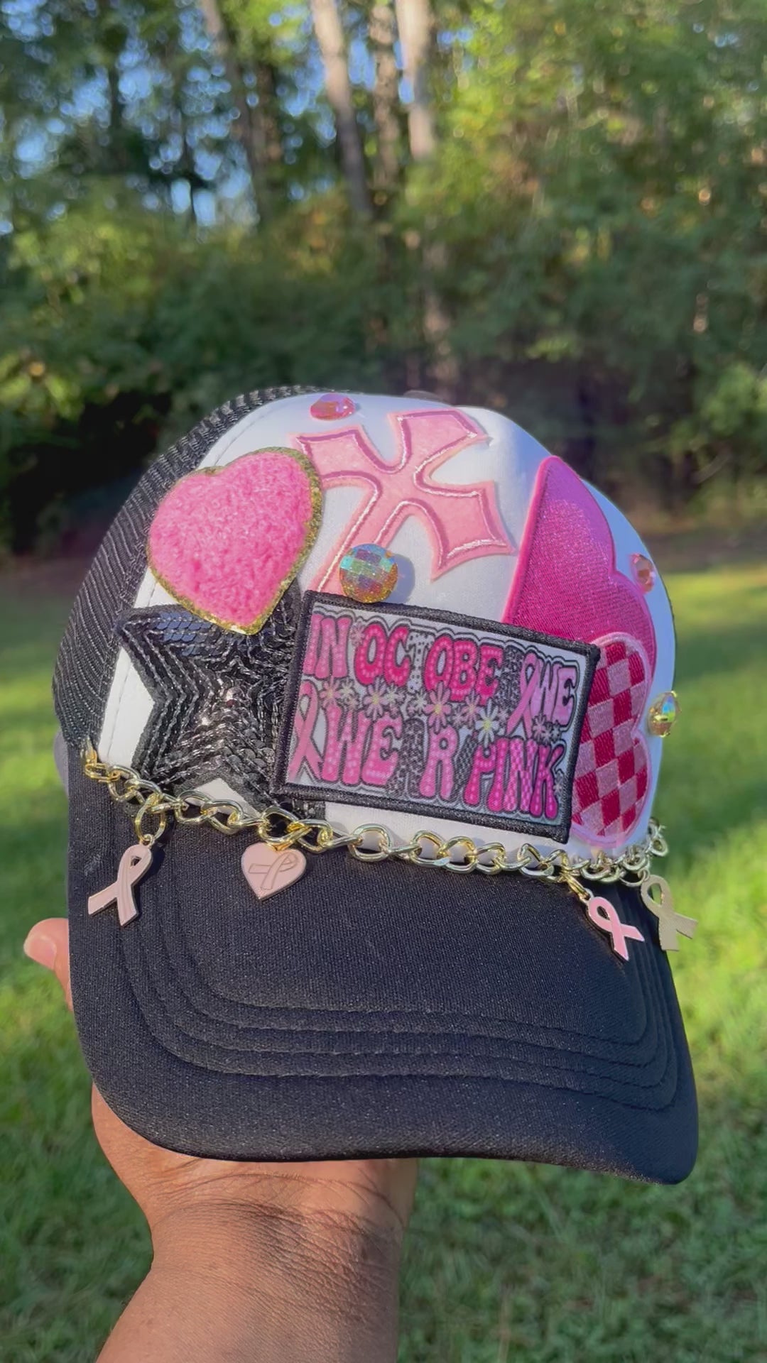 Trucker hat can be customized for all genders. All hats come with assorted patches & jewels to match breast cancer patch.
