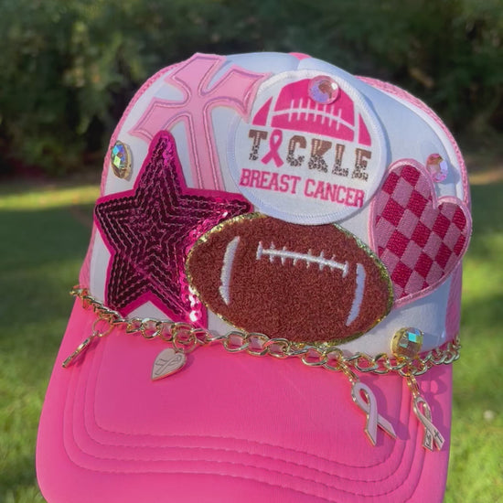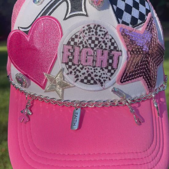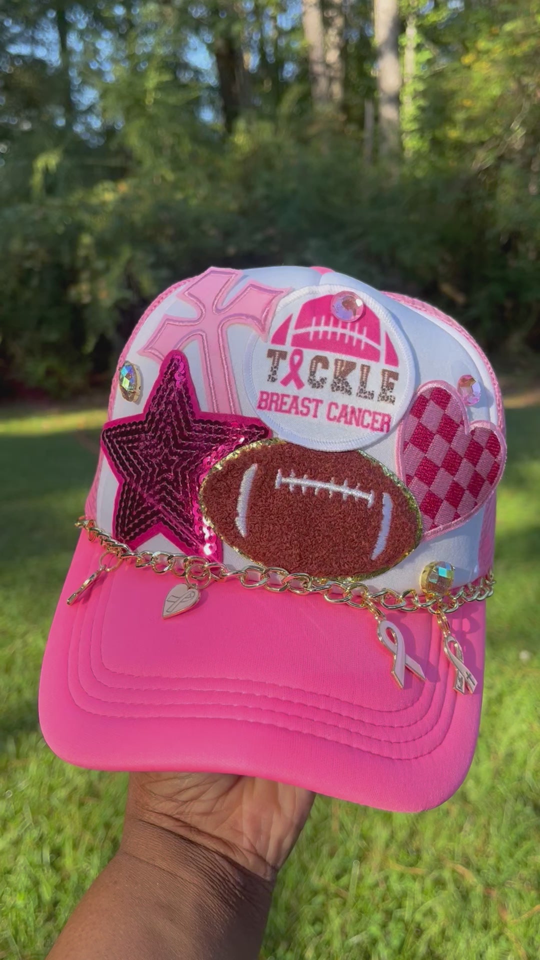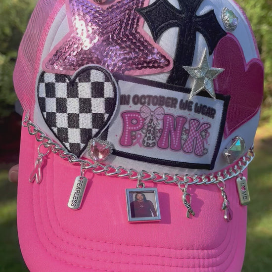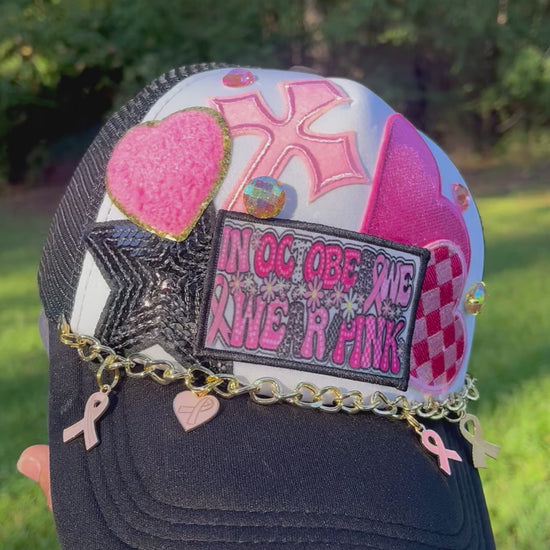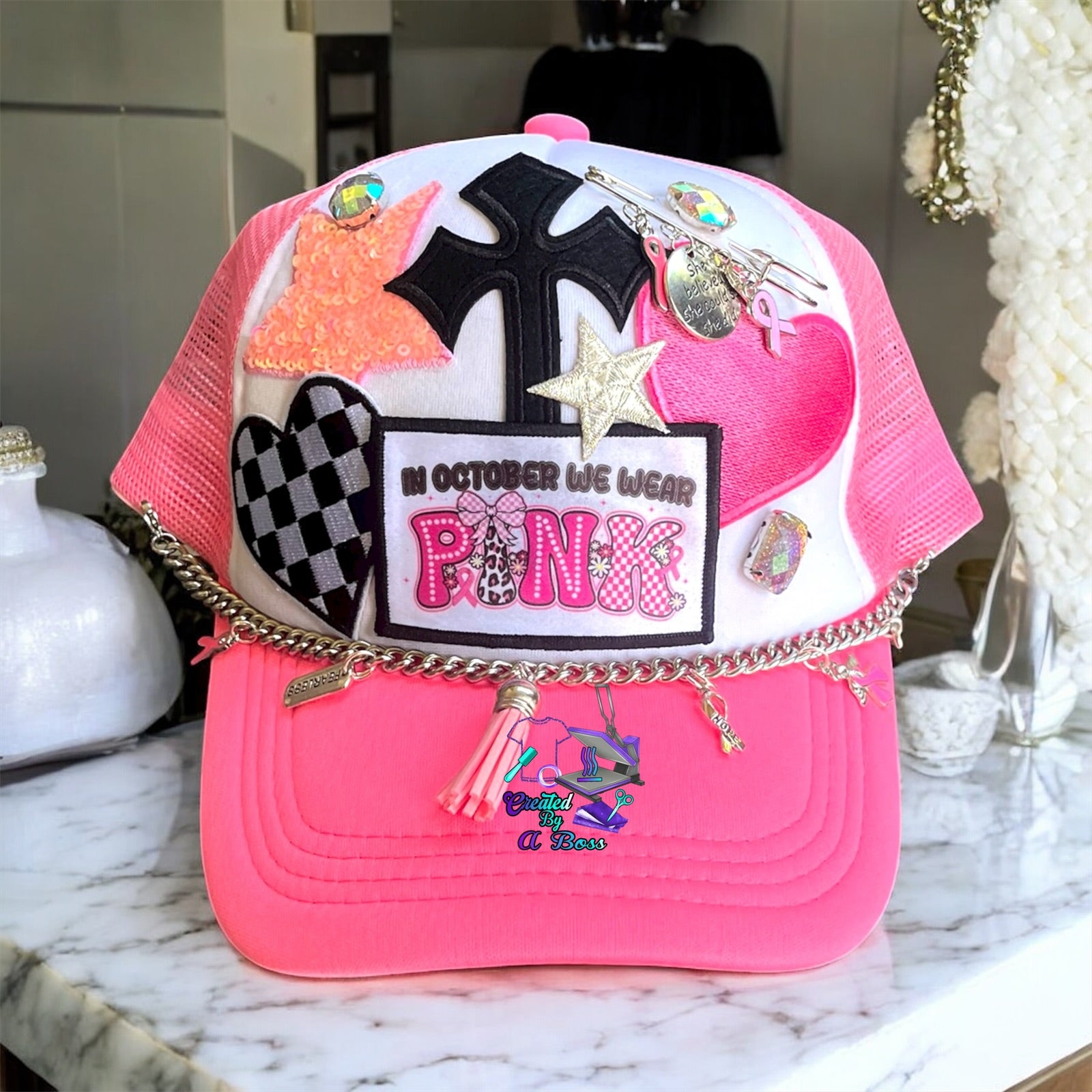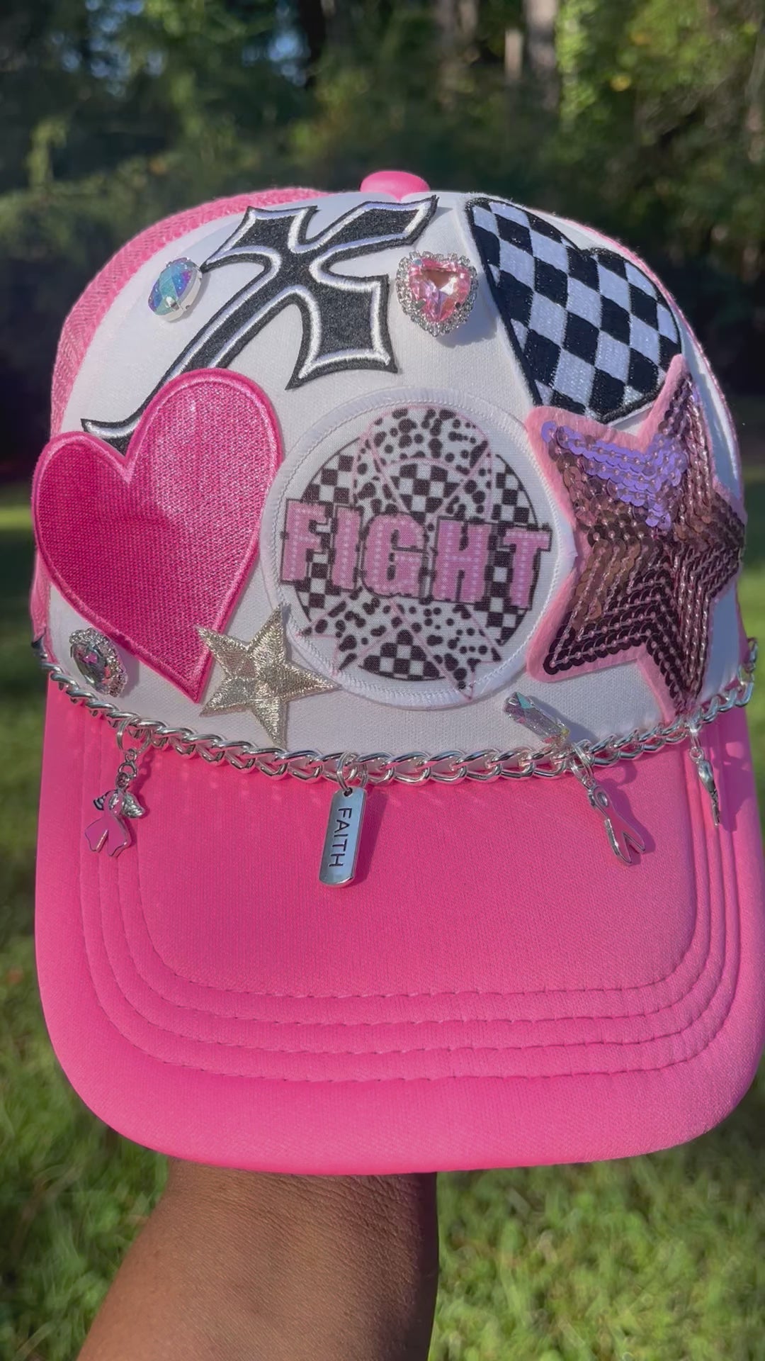 Trucker hat can be customized for all genders. All hats come with assorted patches & jewels to match breast cancer patch.