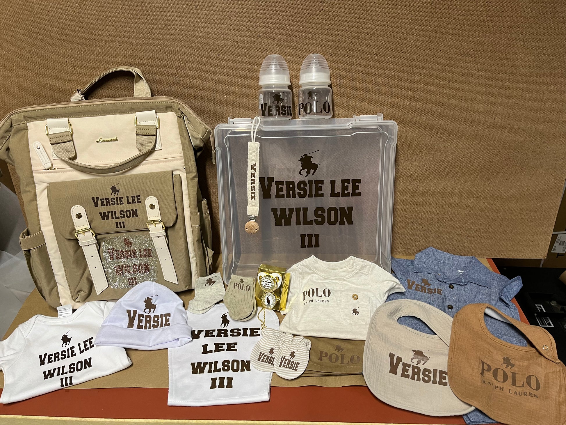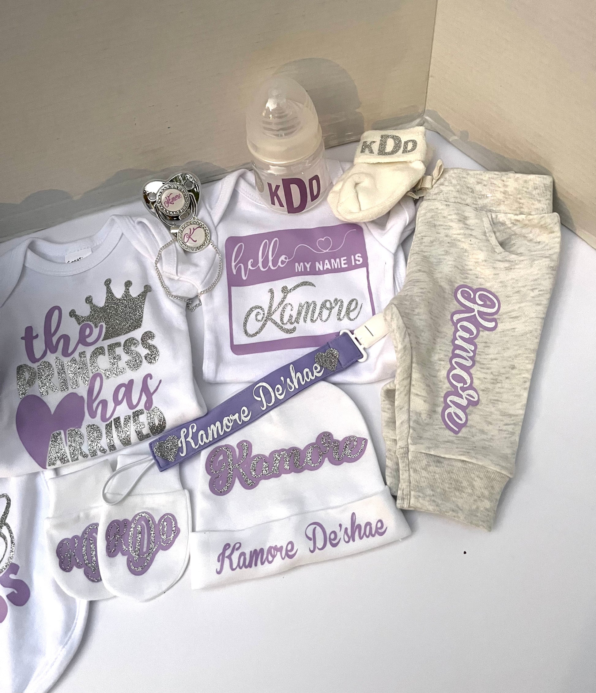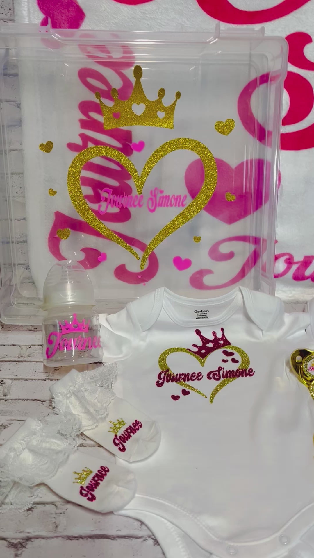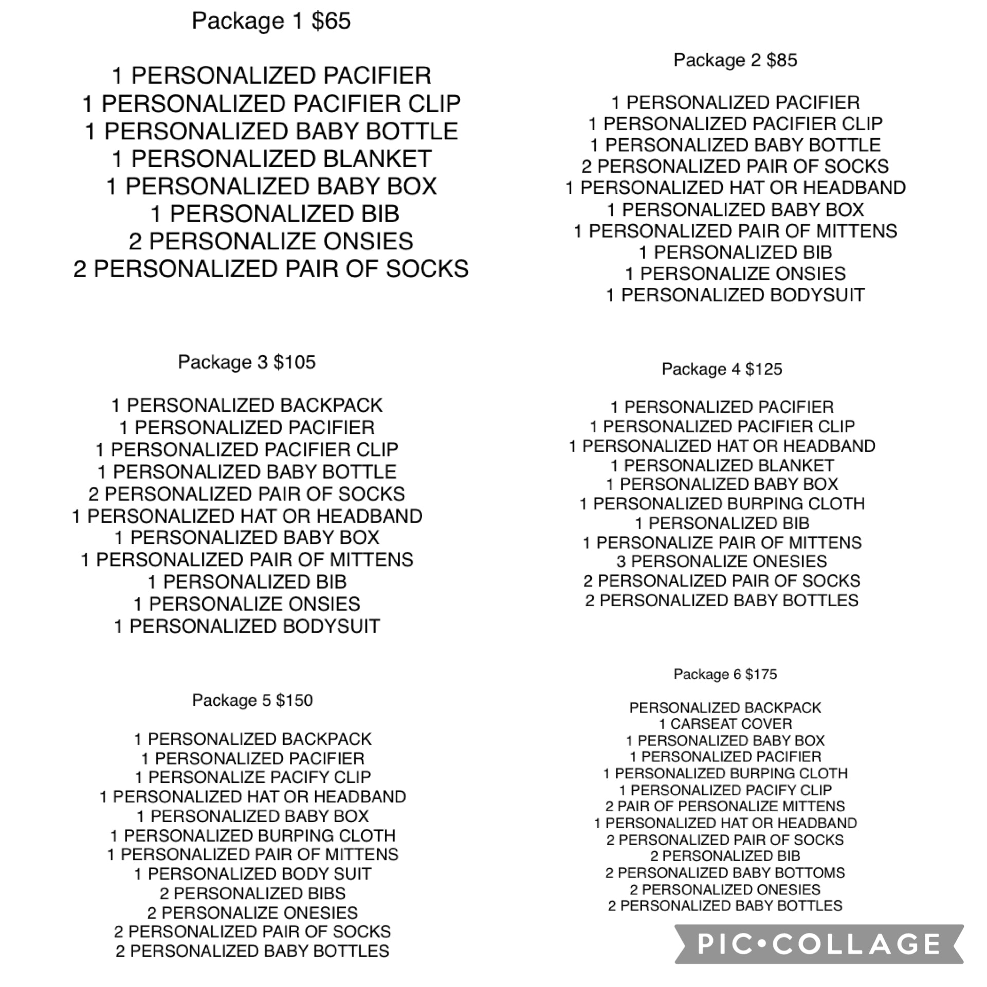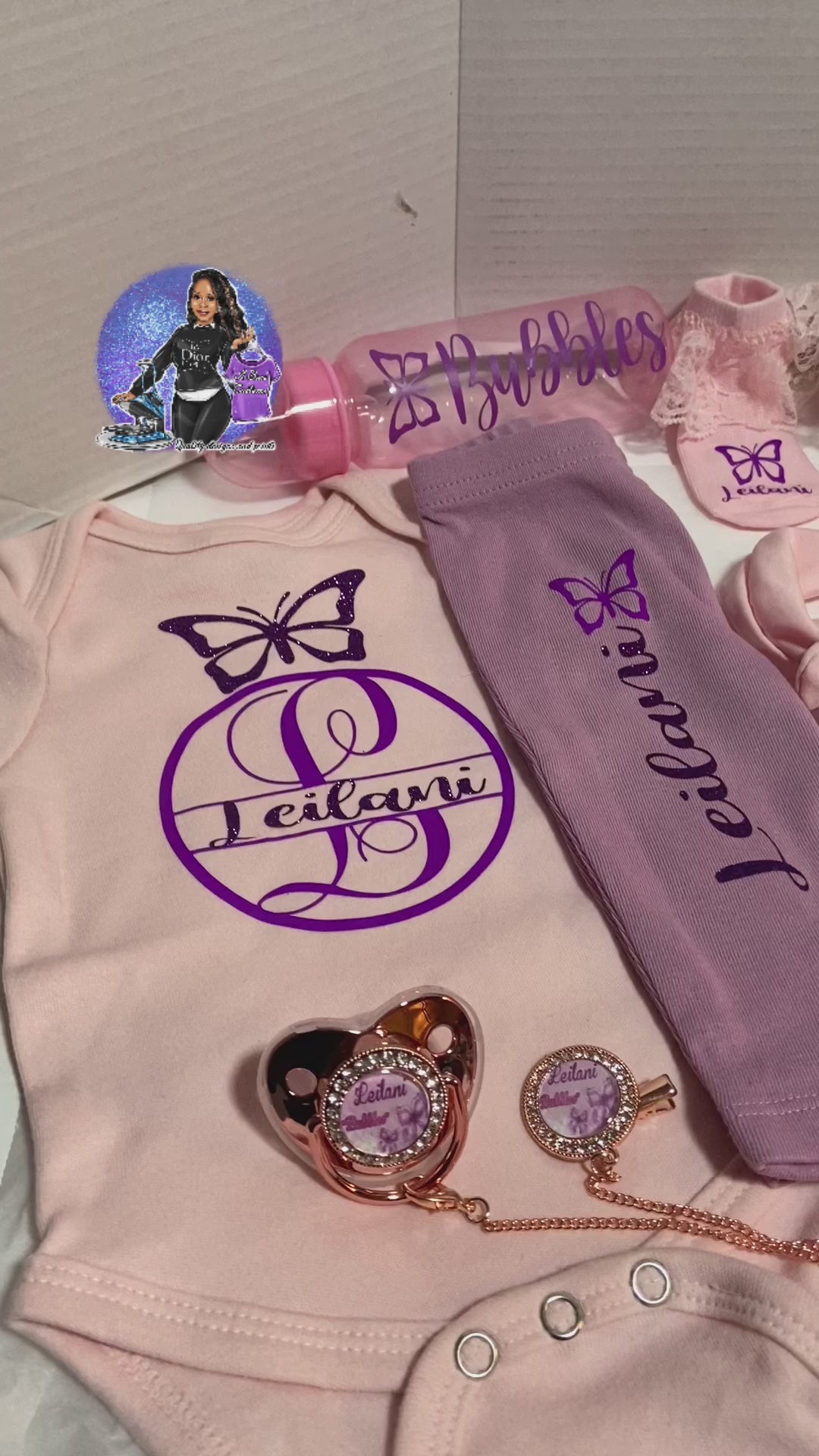 Personalized baby items. Sizes are typically 0-3 month unless specified otherwise. Items are designed with htv vinyl, sublimation, and or transfer images. Any color or design. All packages come with clear mini bottles. Sublimation bottles are an additional fee.