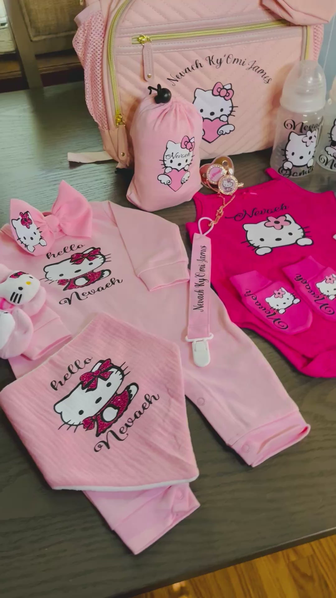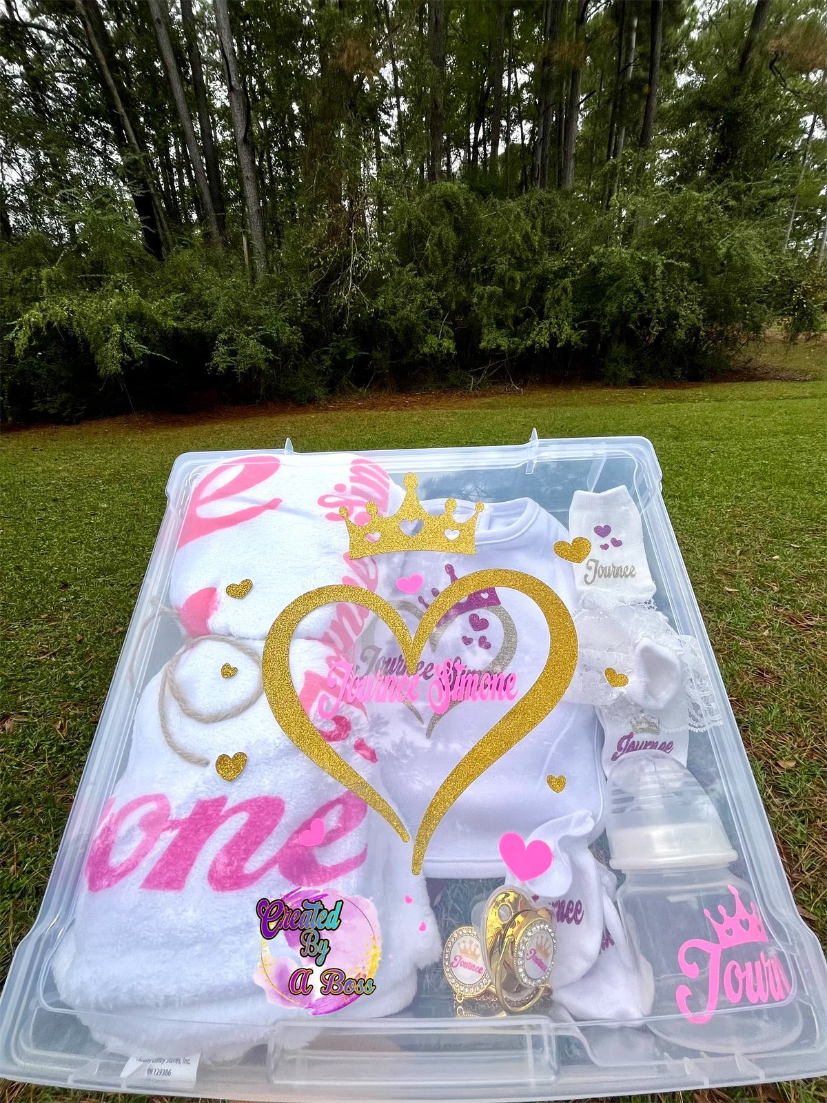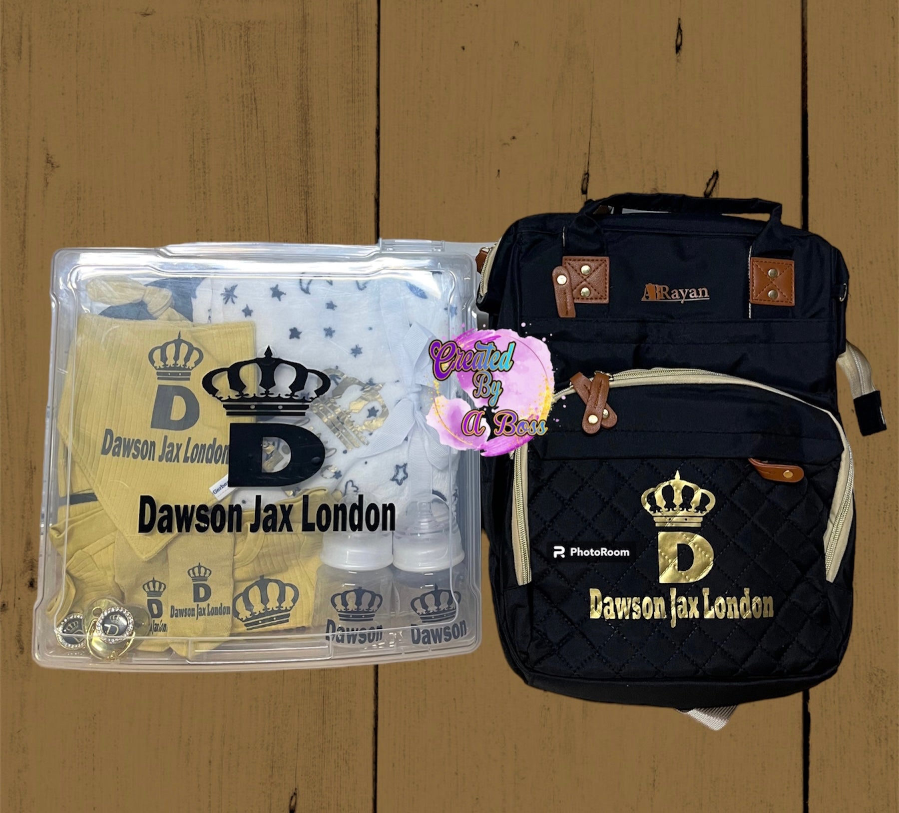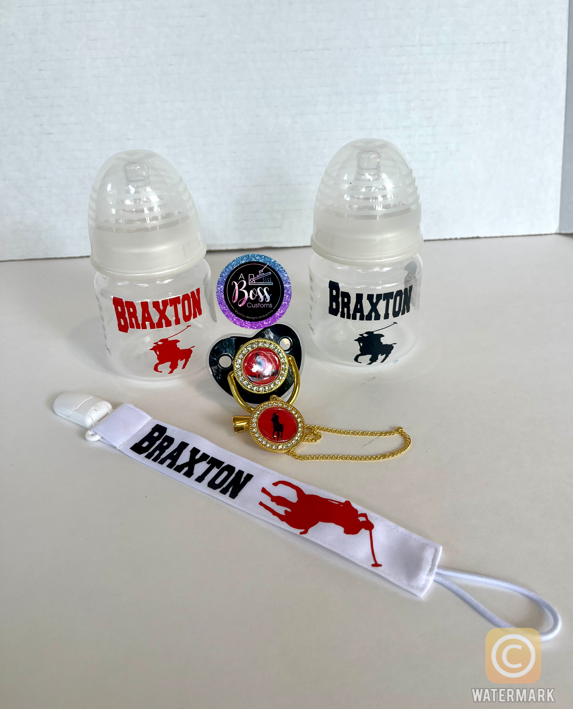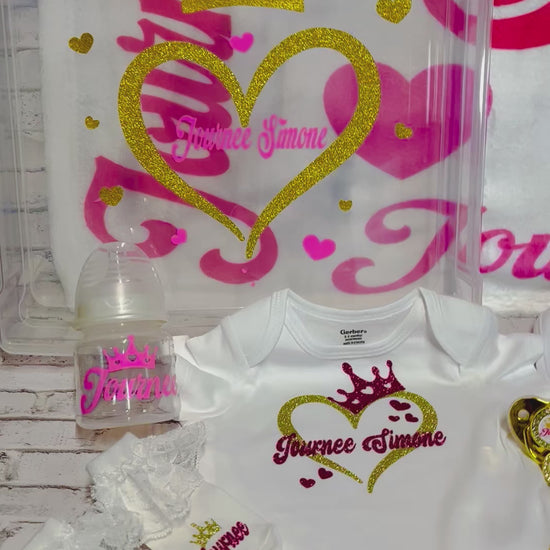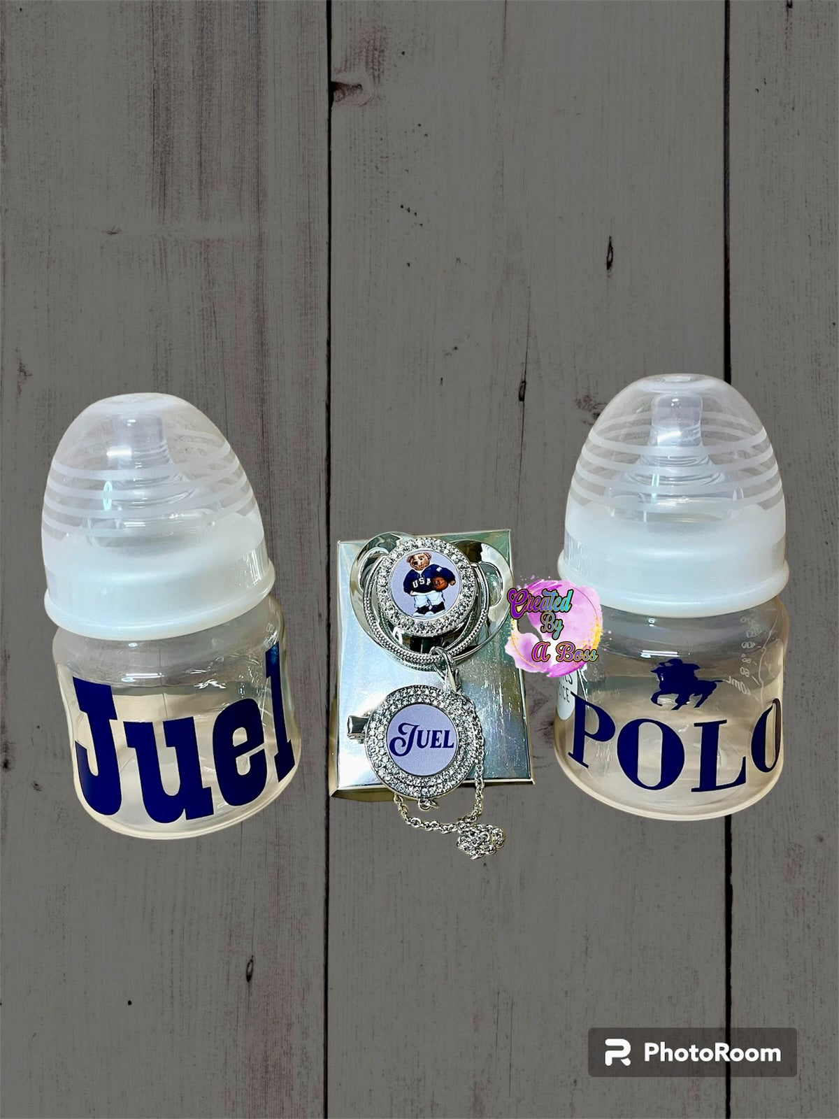 Personalized baby items. Sizes are typically 0-3 month unless specified otherwise. Items are designed with htv vinyl, sublimation, and or transfer images. Any color or design. All packages come with clear mini bottles. Sublimation bottles are an additional fee.