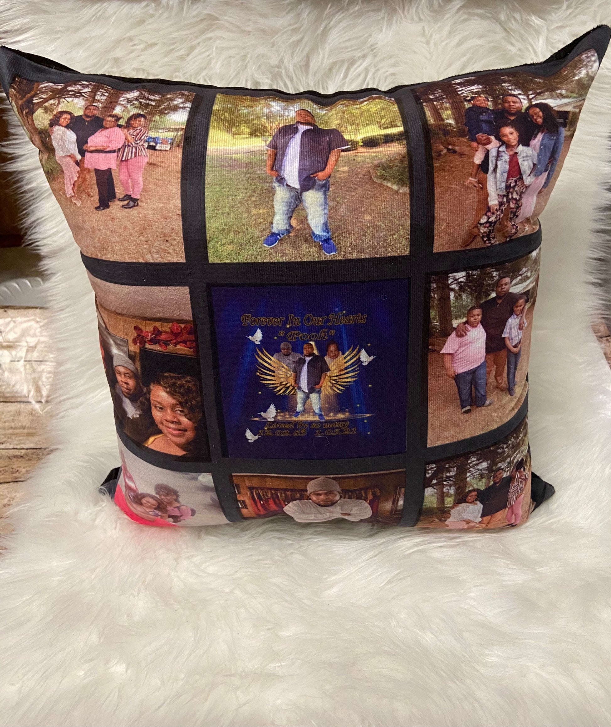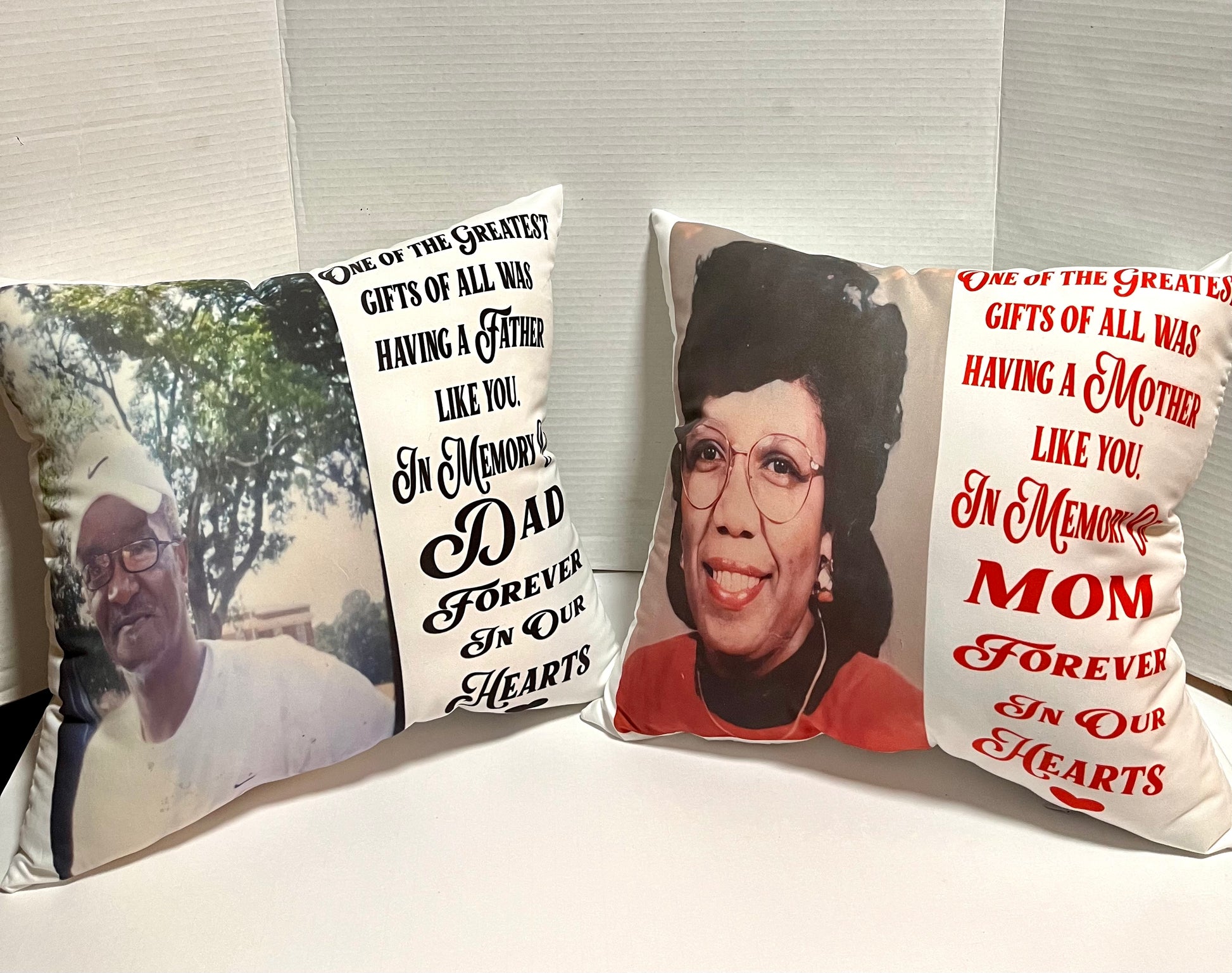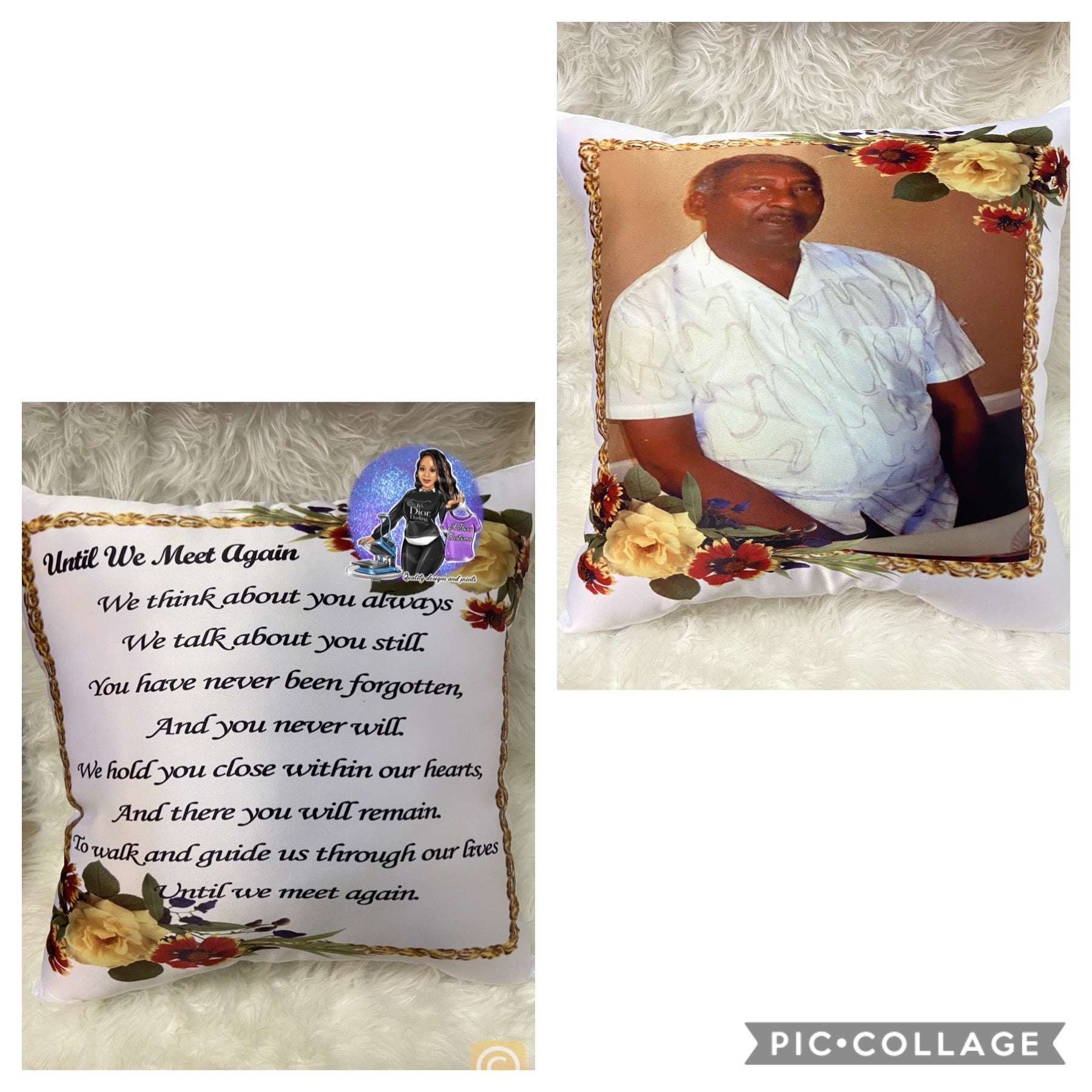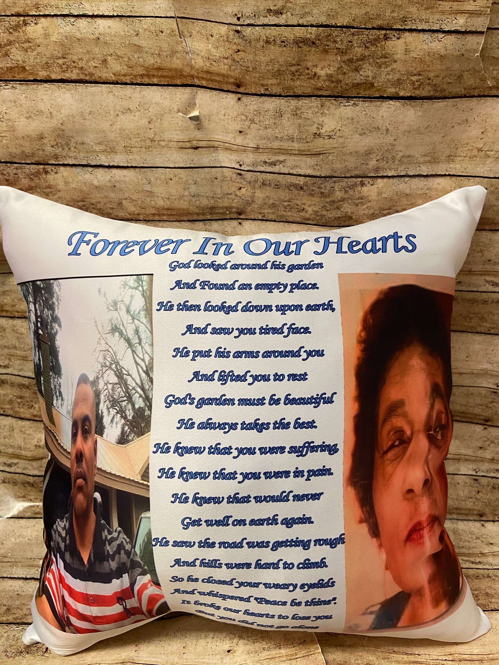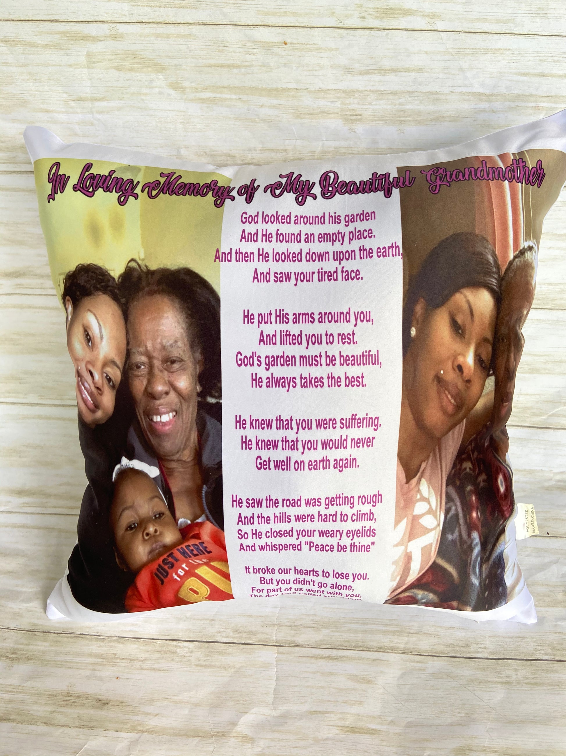 Personalize memorial pillows for any occasion. Comes in sizes 15x15 or 16x16 depending on the manufacturer. You may get any design or color of your choice. Please upload good, quality pics. All sales are final. No refunds or exchanges.