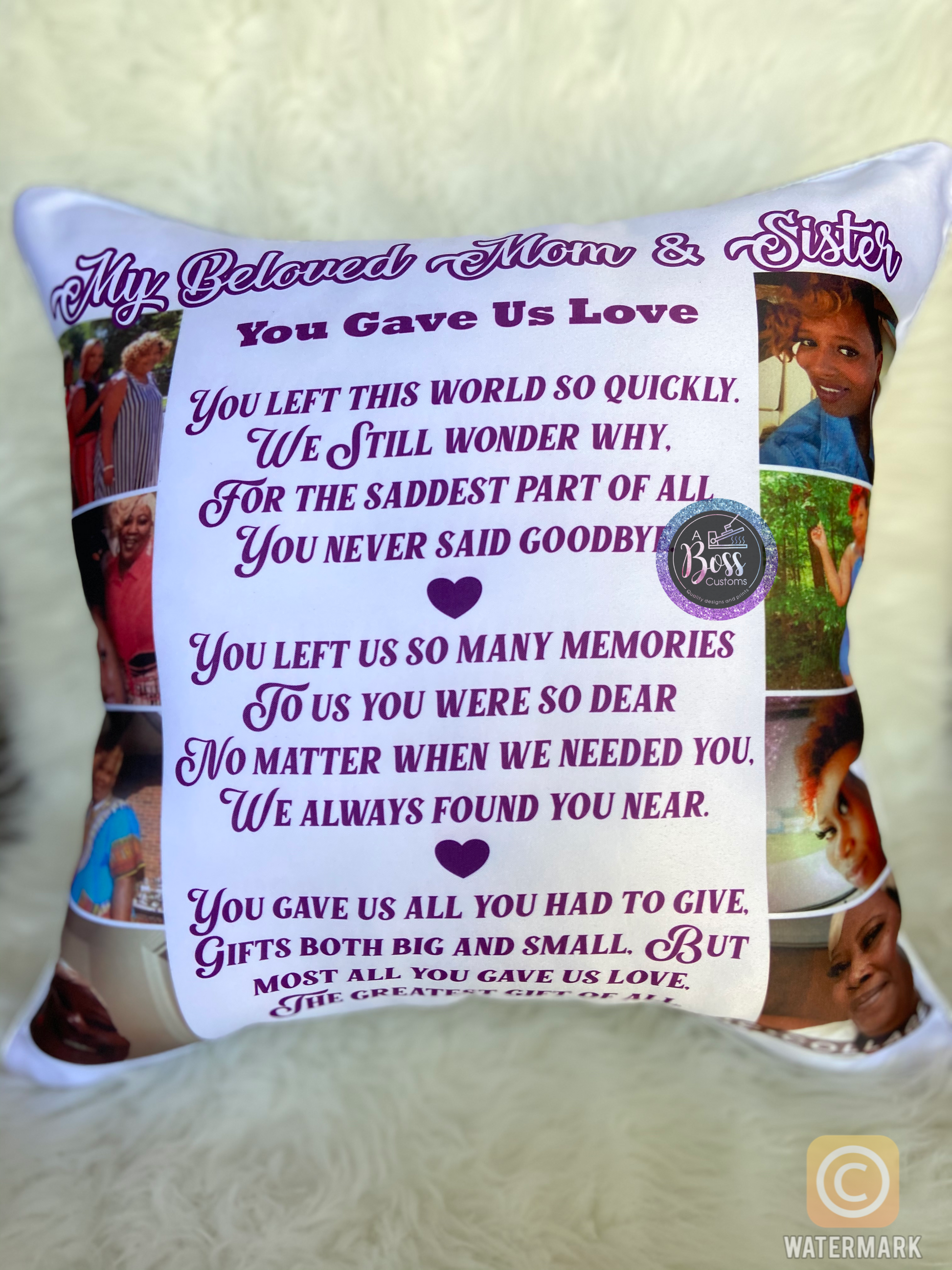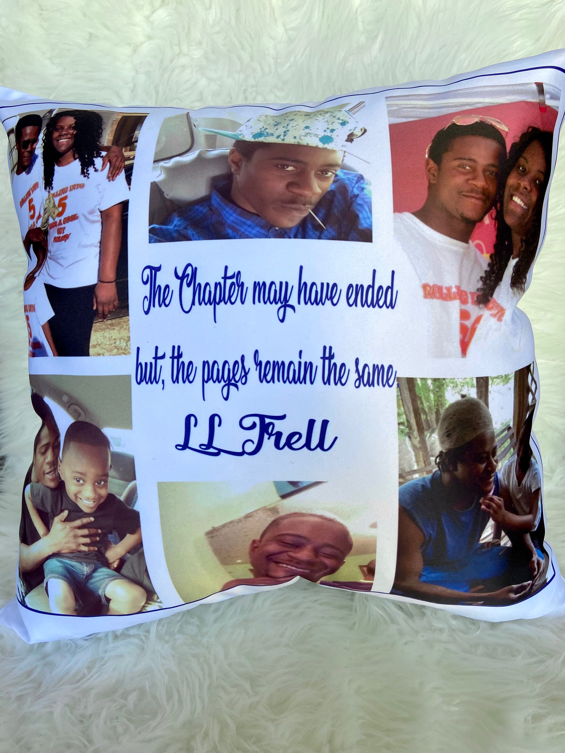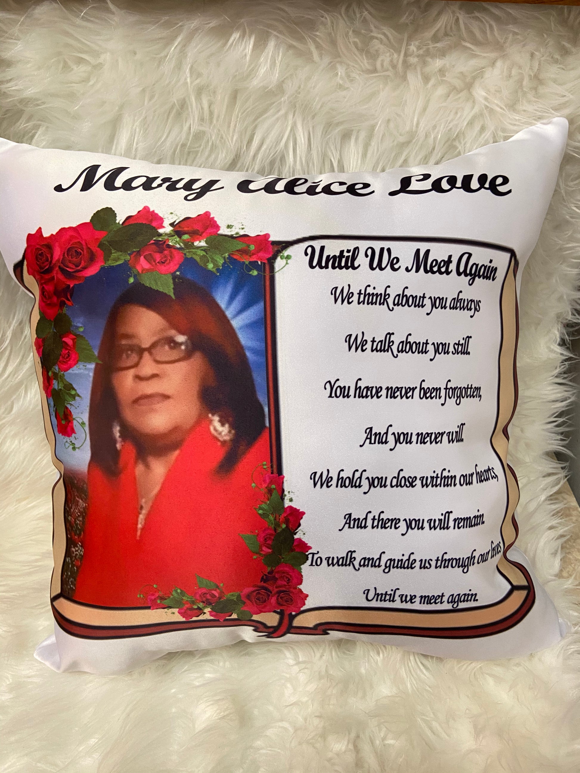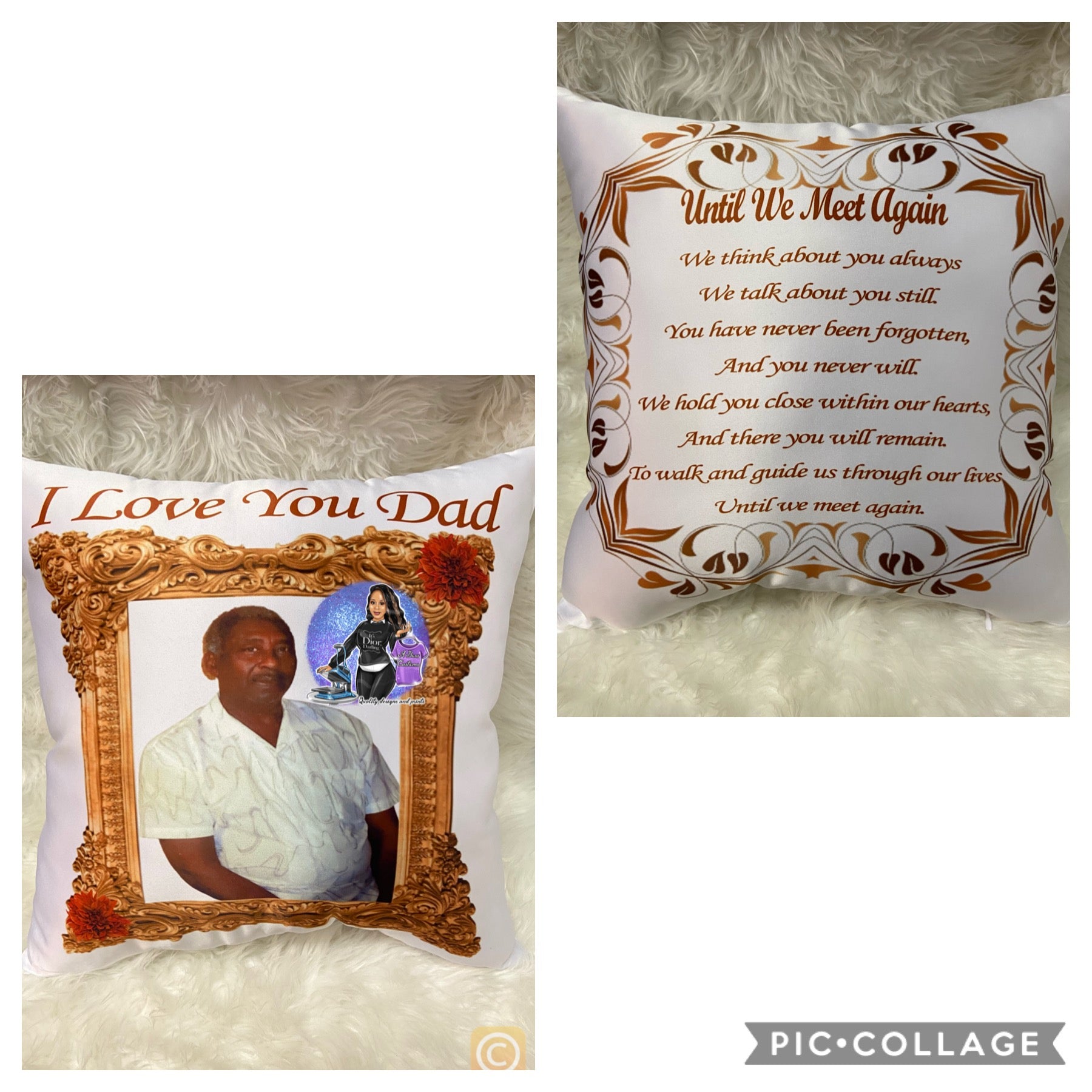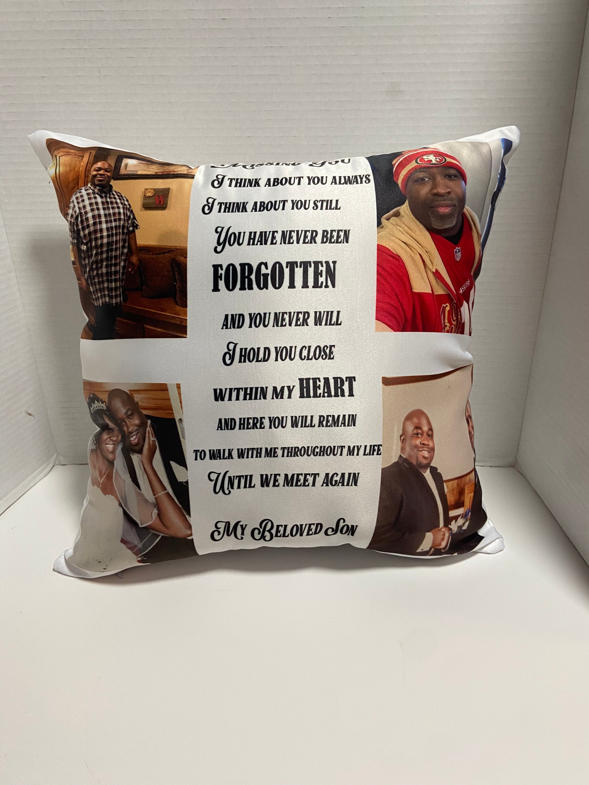 Personalize memorial pillows for any occasion. Comes in sizes 15x15 or 16x16 depending on the manufacturer. You may get any design or color of your choice. Please upload good, quality pics. All sales are final. No refunds or exchanges.