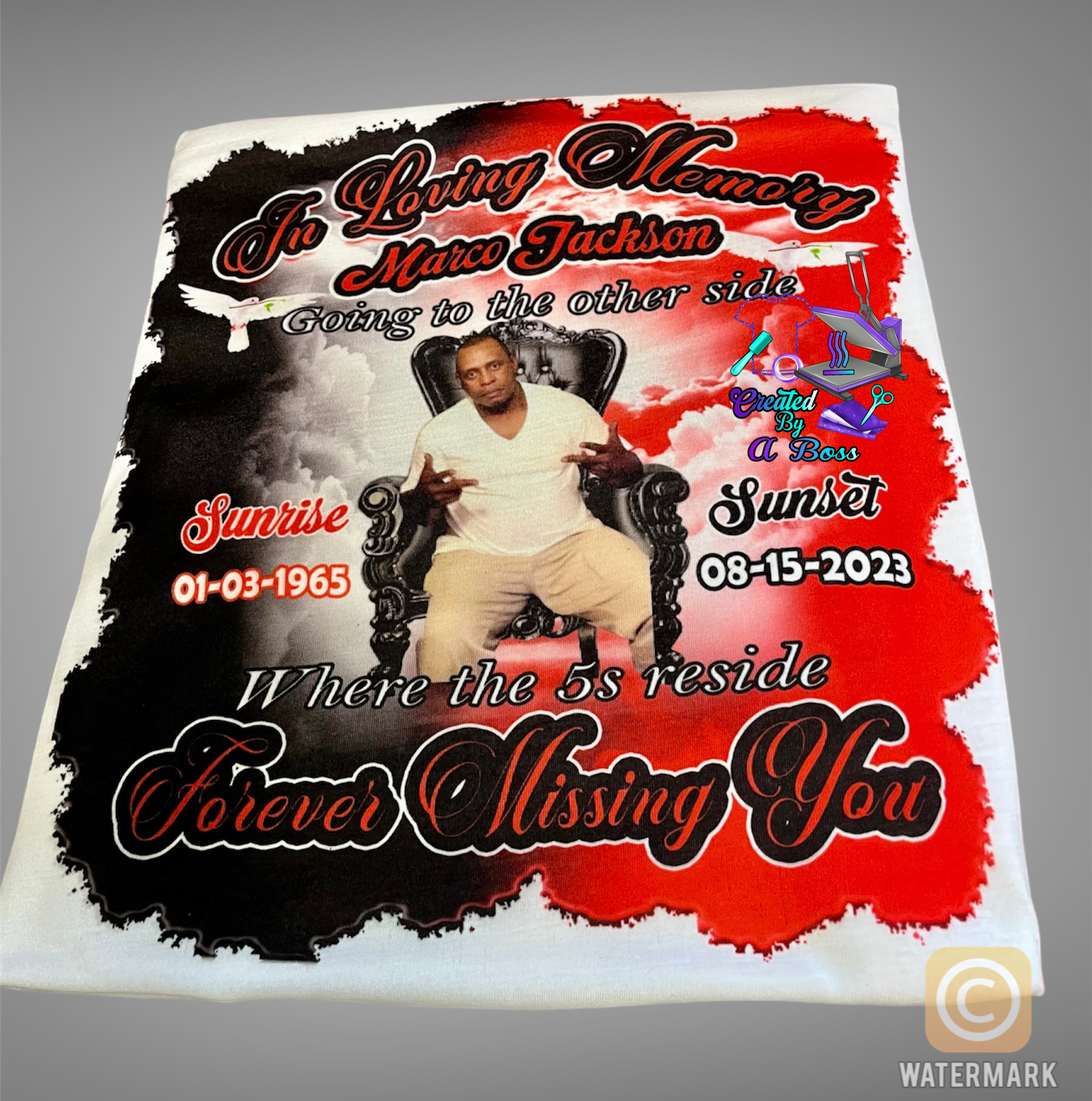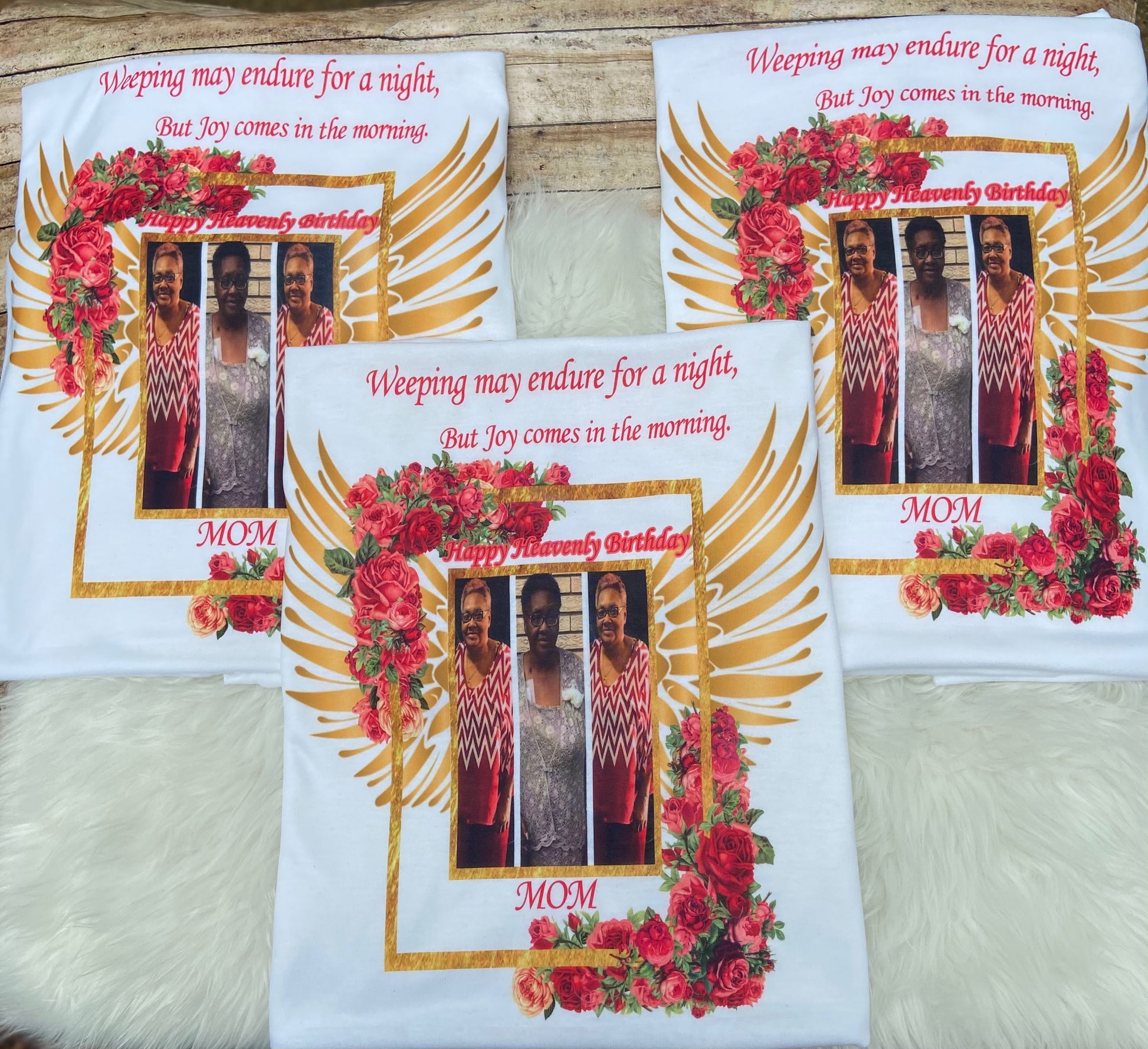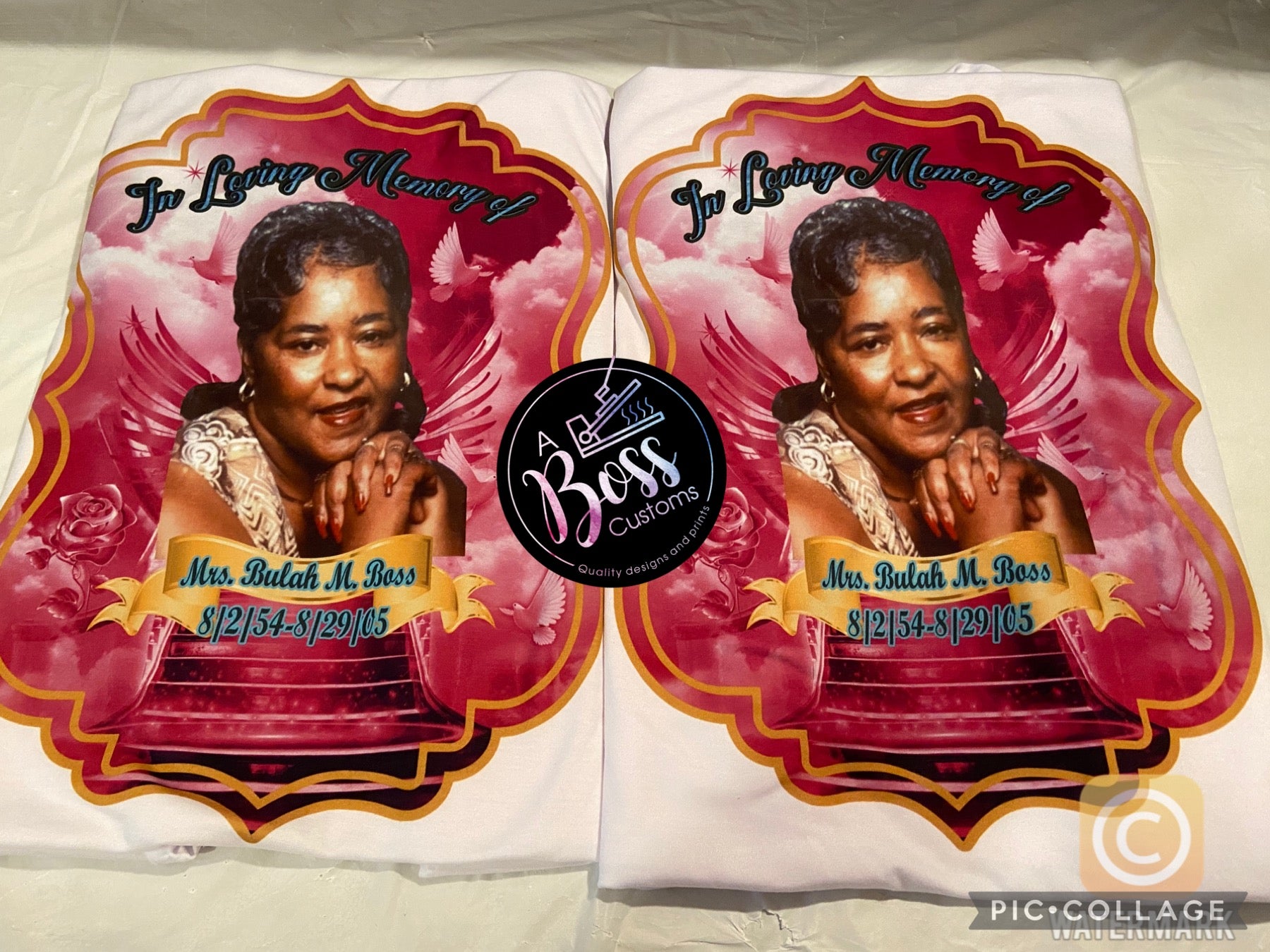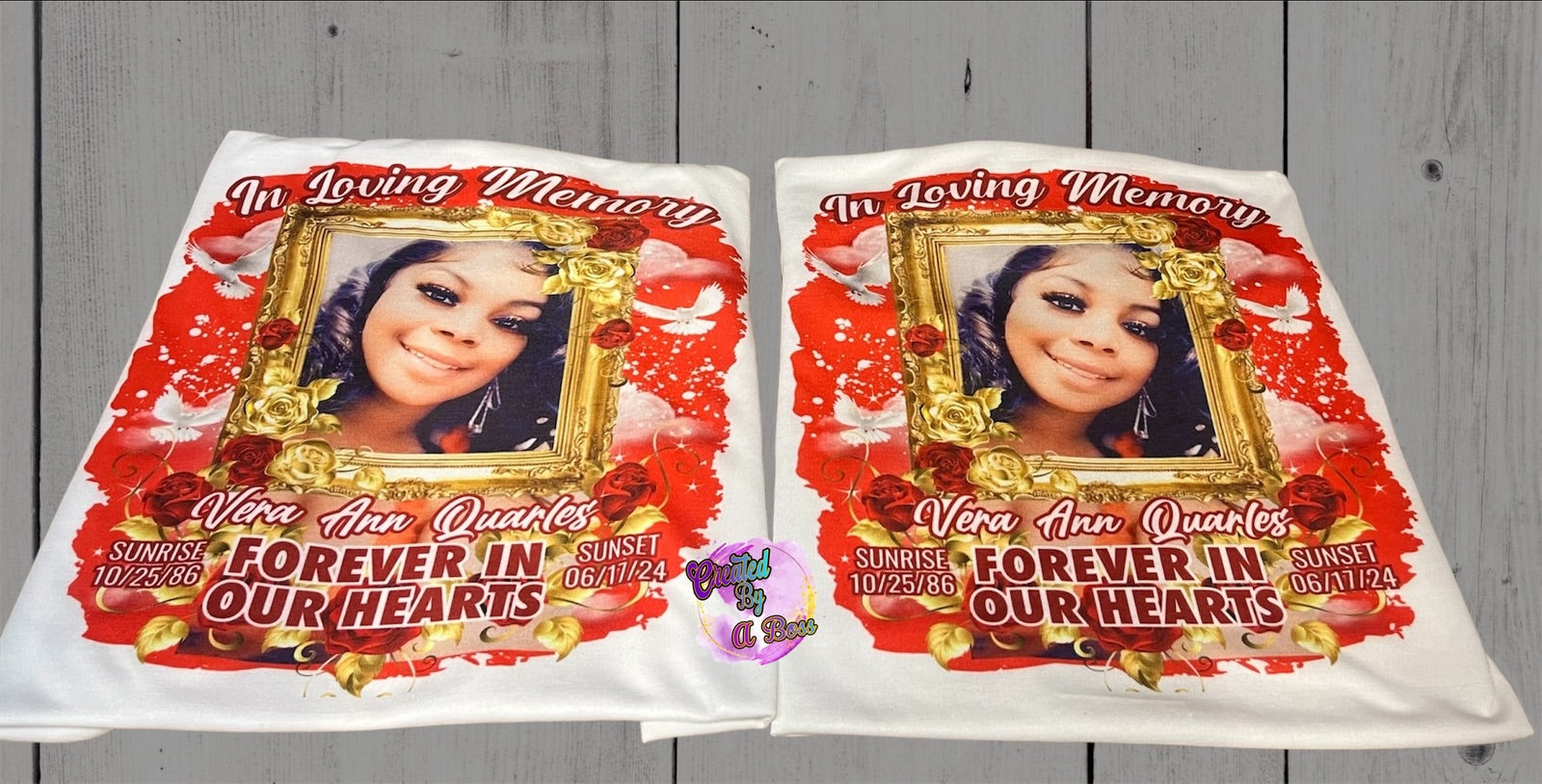Memorial shirts can be customize with any design or color. Sublimation designs work best on white or light colored shirts. Good quality pictures are preferred for the best results. No refunds or exchanges. All sales are final.