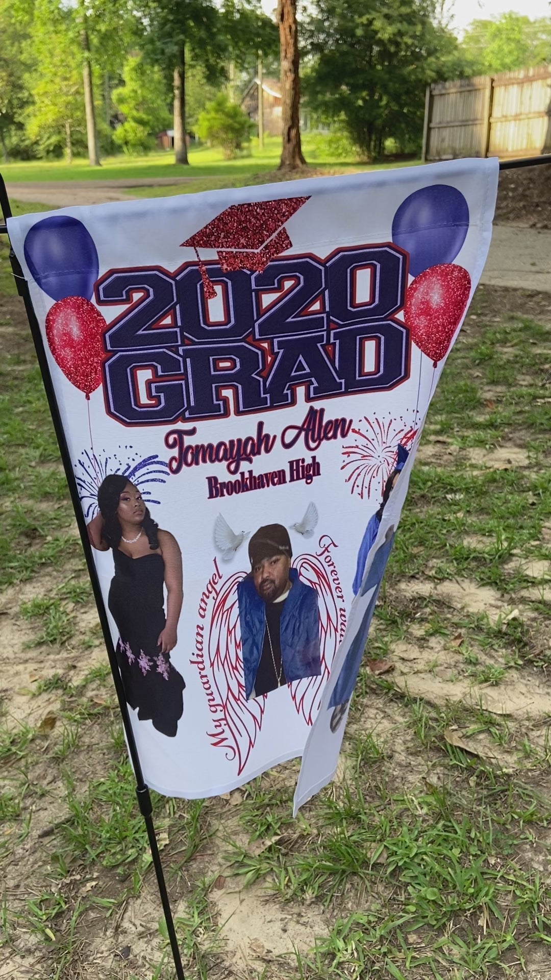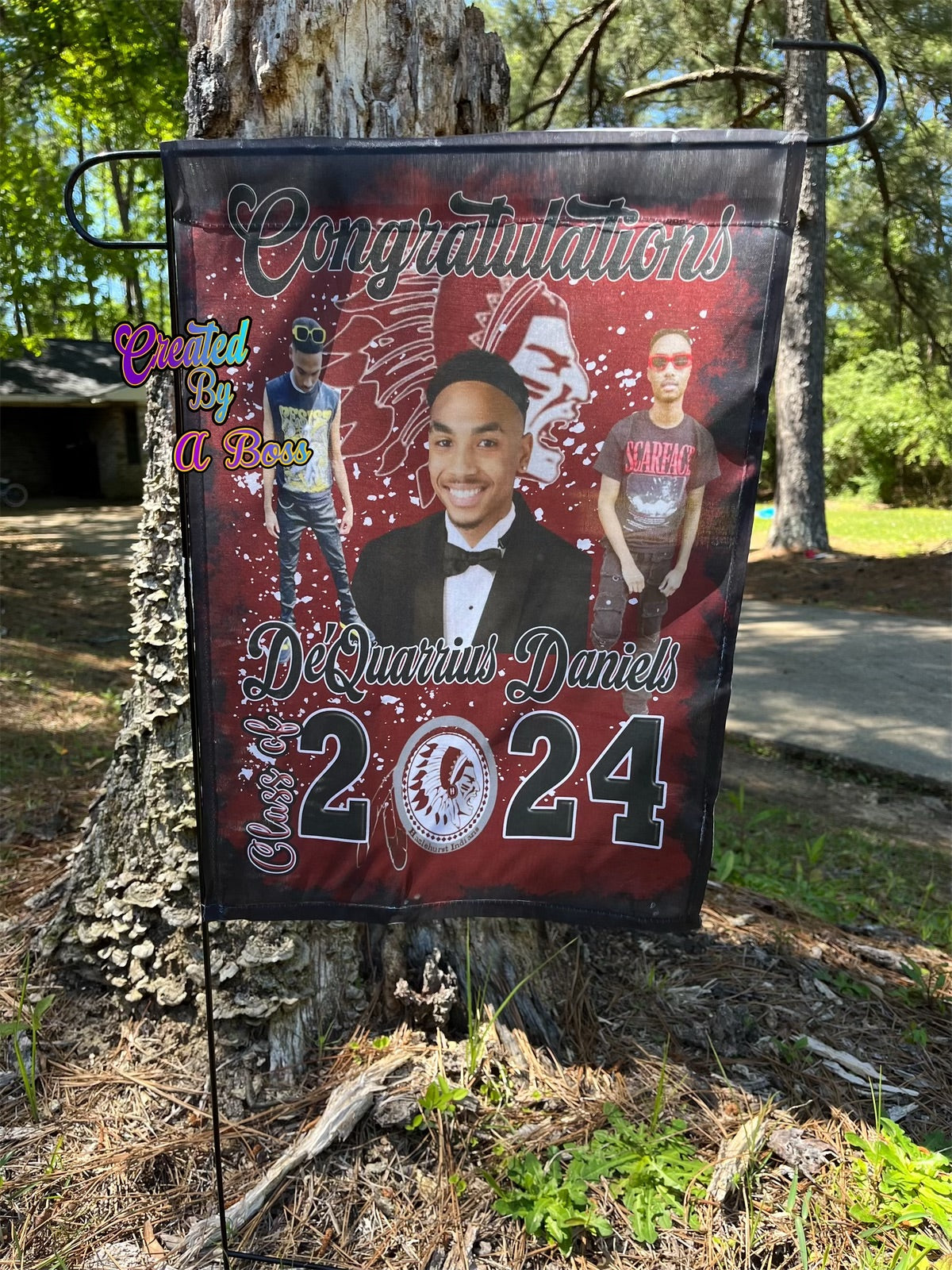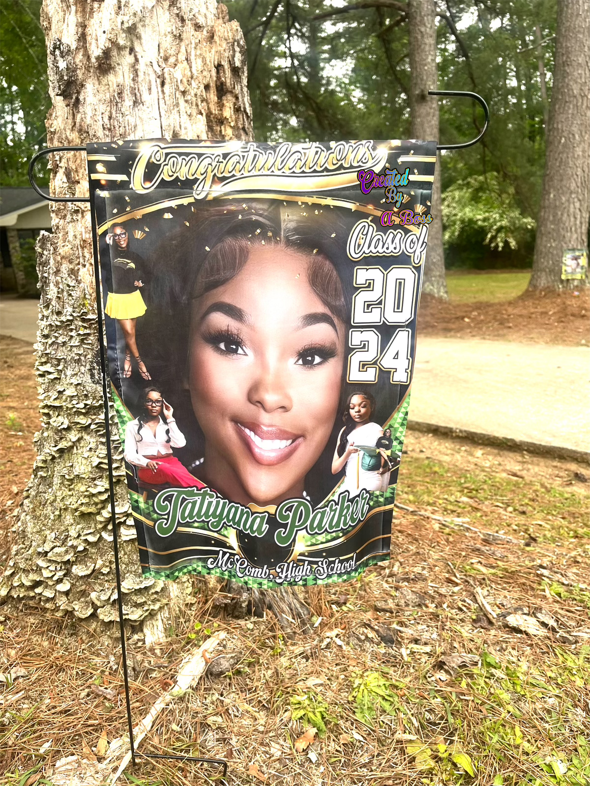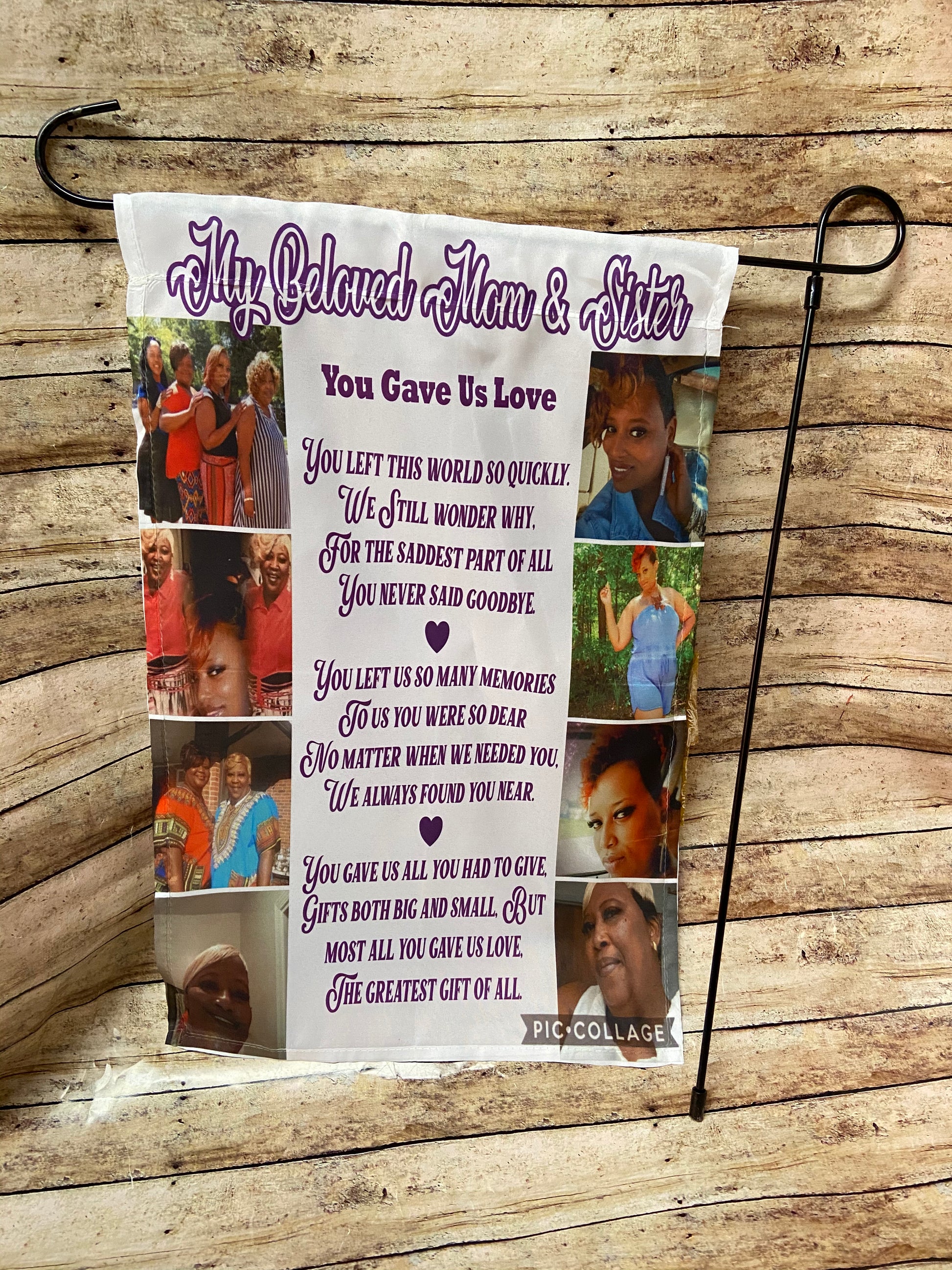 Garden flags are 12x18 made of thin polyester material. Perfect for gardens, front yards, grave sights and much more. Any design, color, or occasion. Pole not included. Thick material double sided.