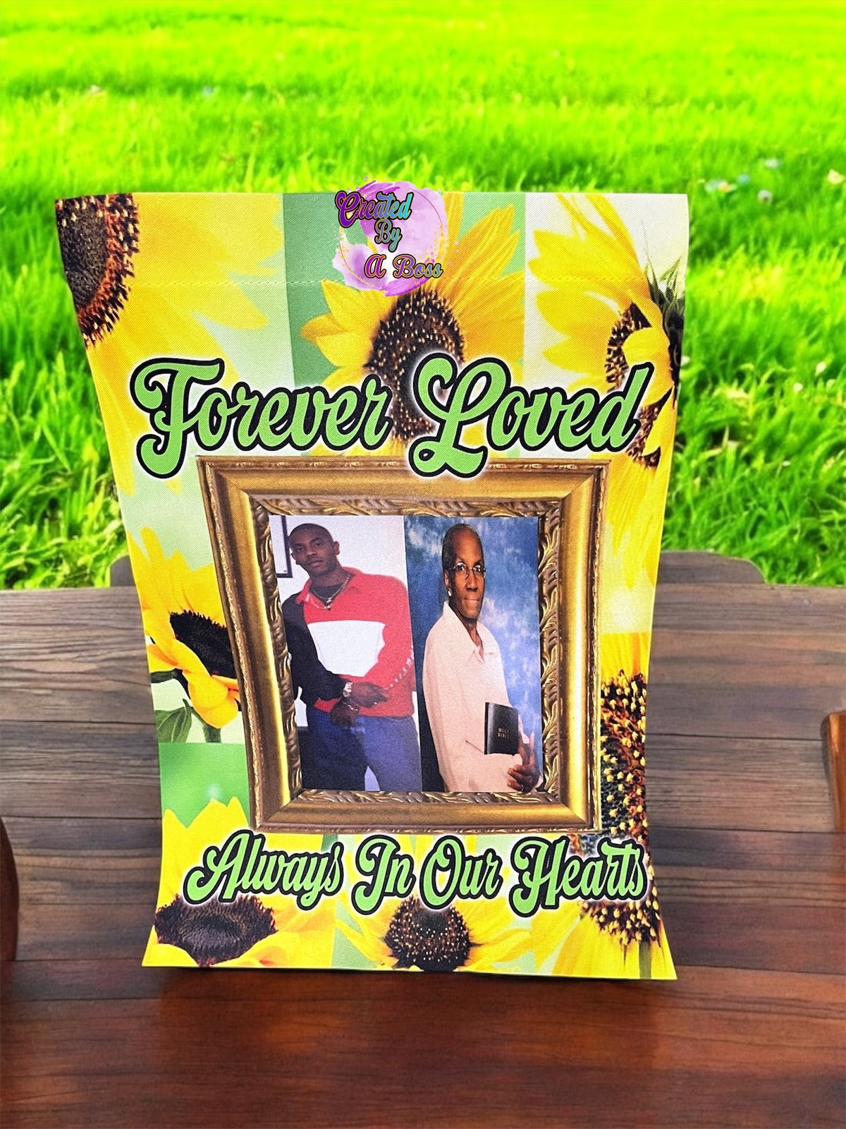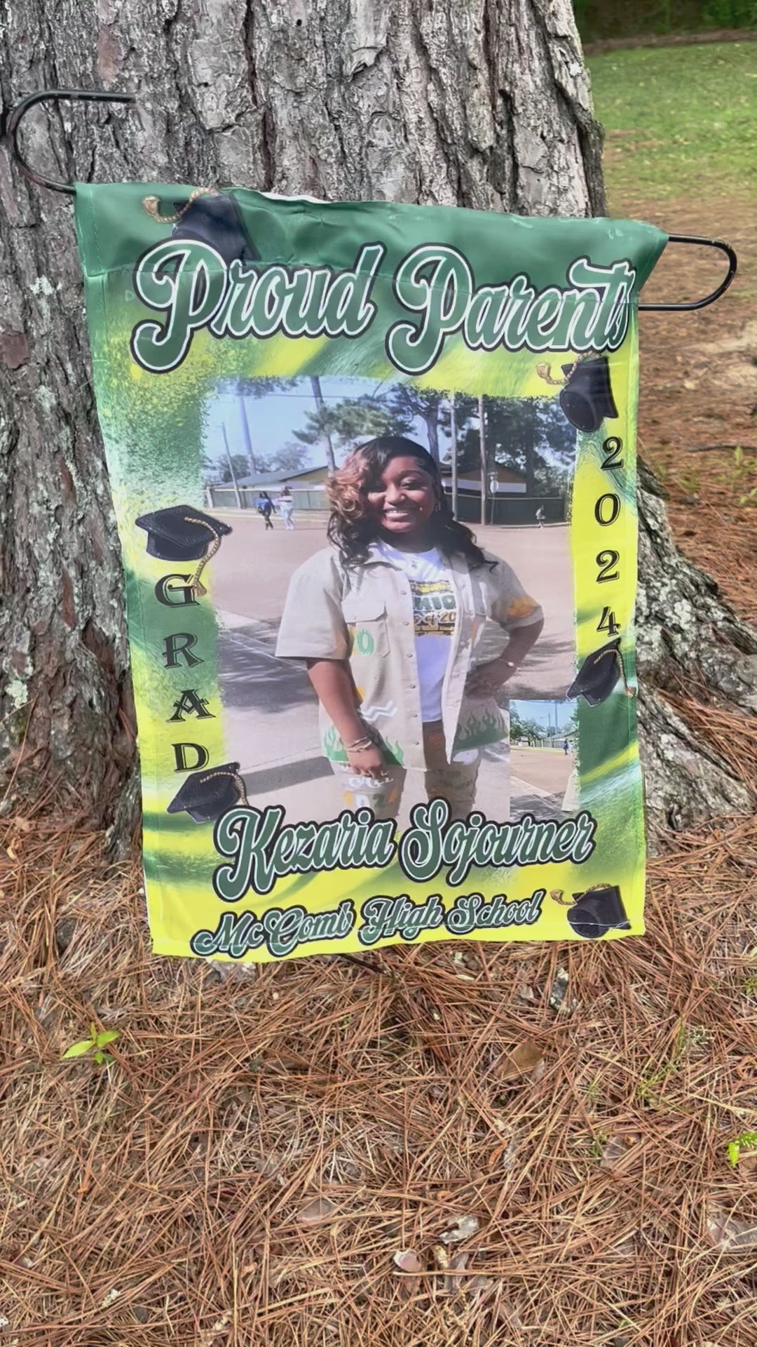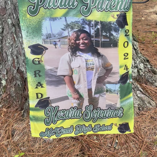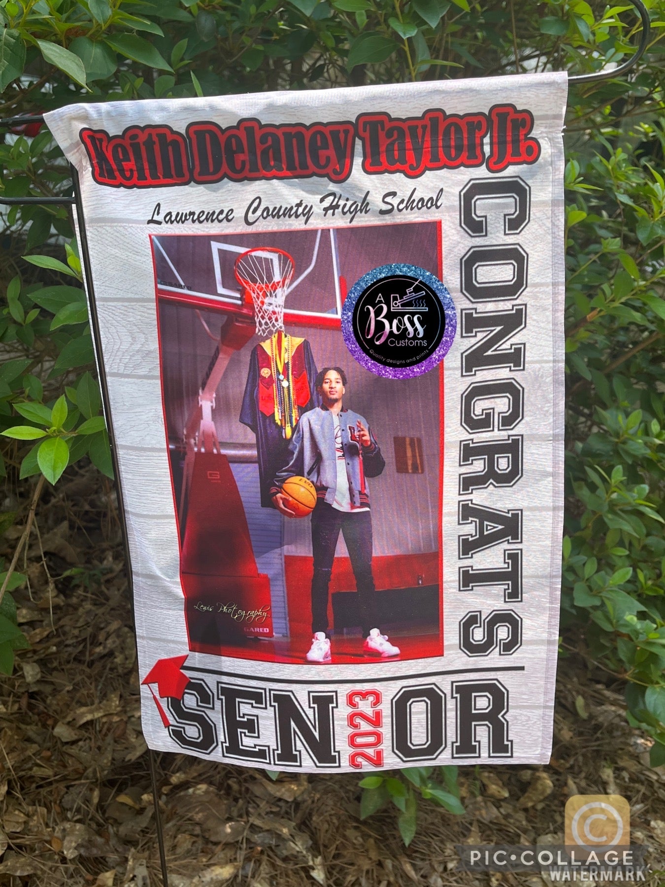 Garden flags are 12x18 made of thin polyester material. Perfect for gardens, front yards, grave sights and much more. Any design, color, or occasion. Pole not included. Thick material double sided.