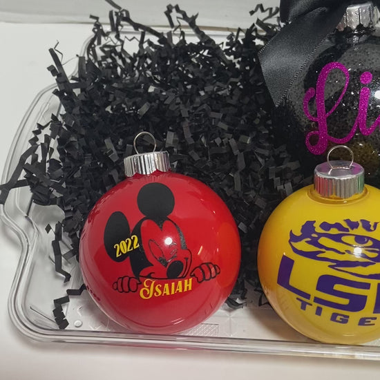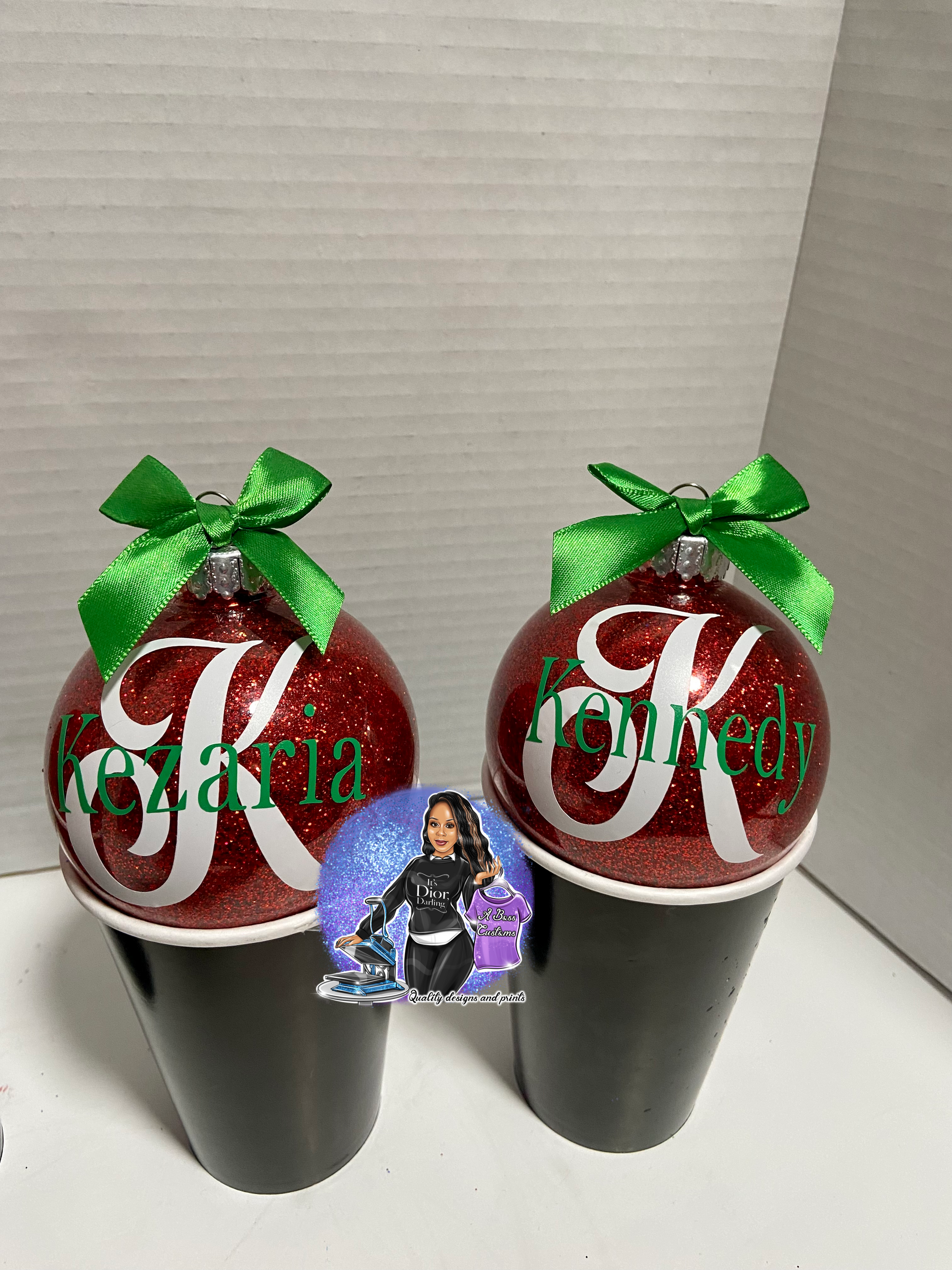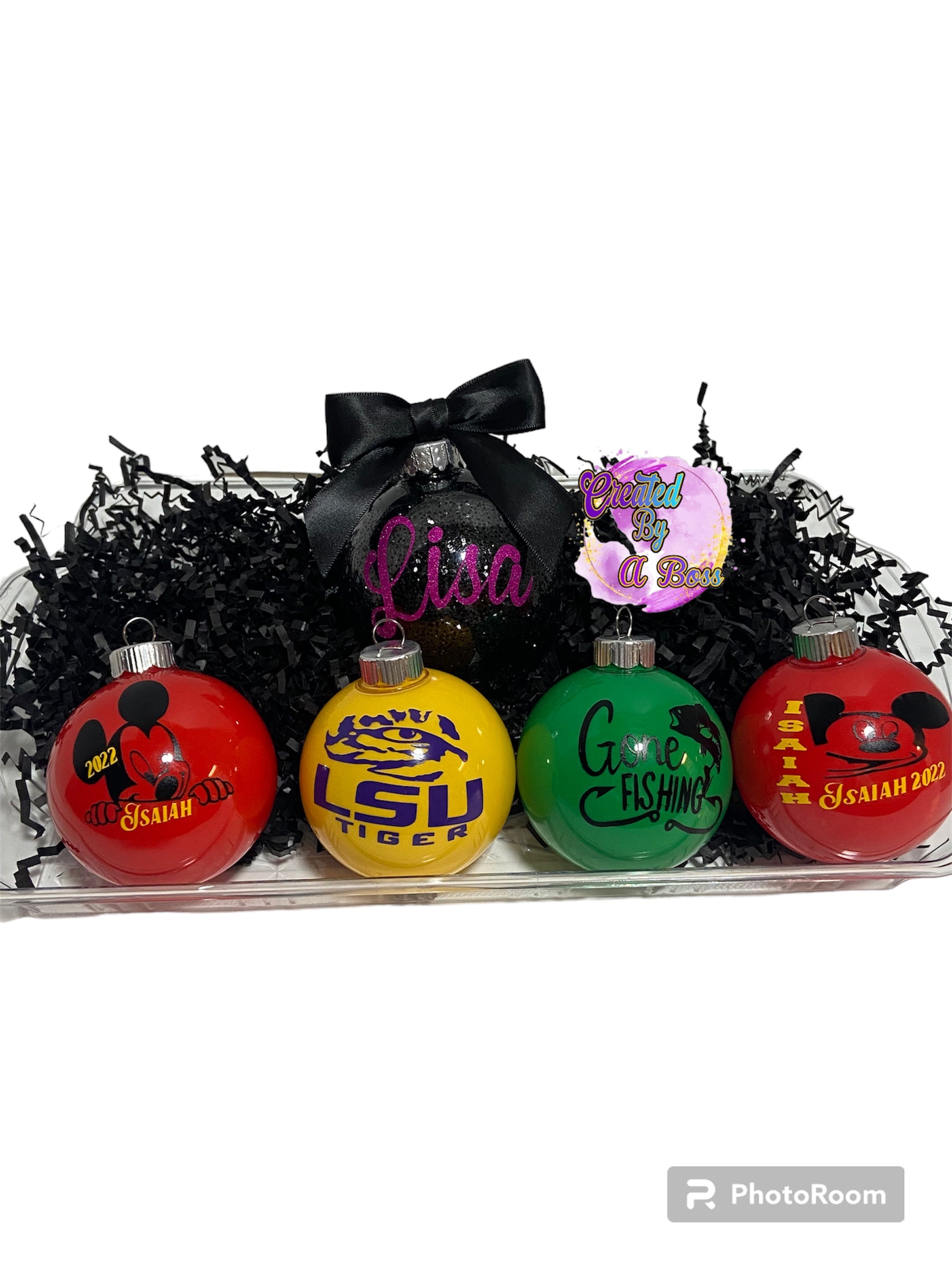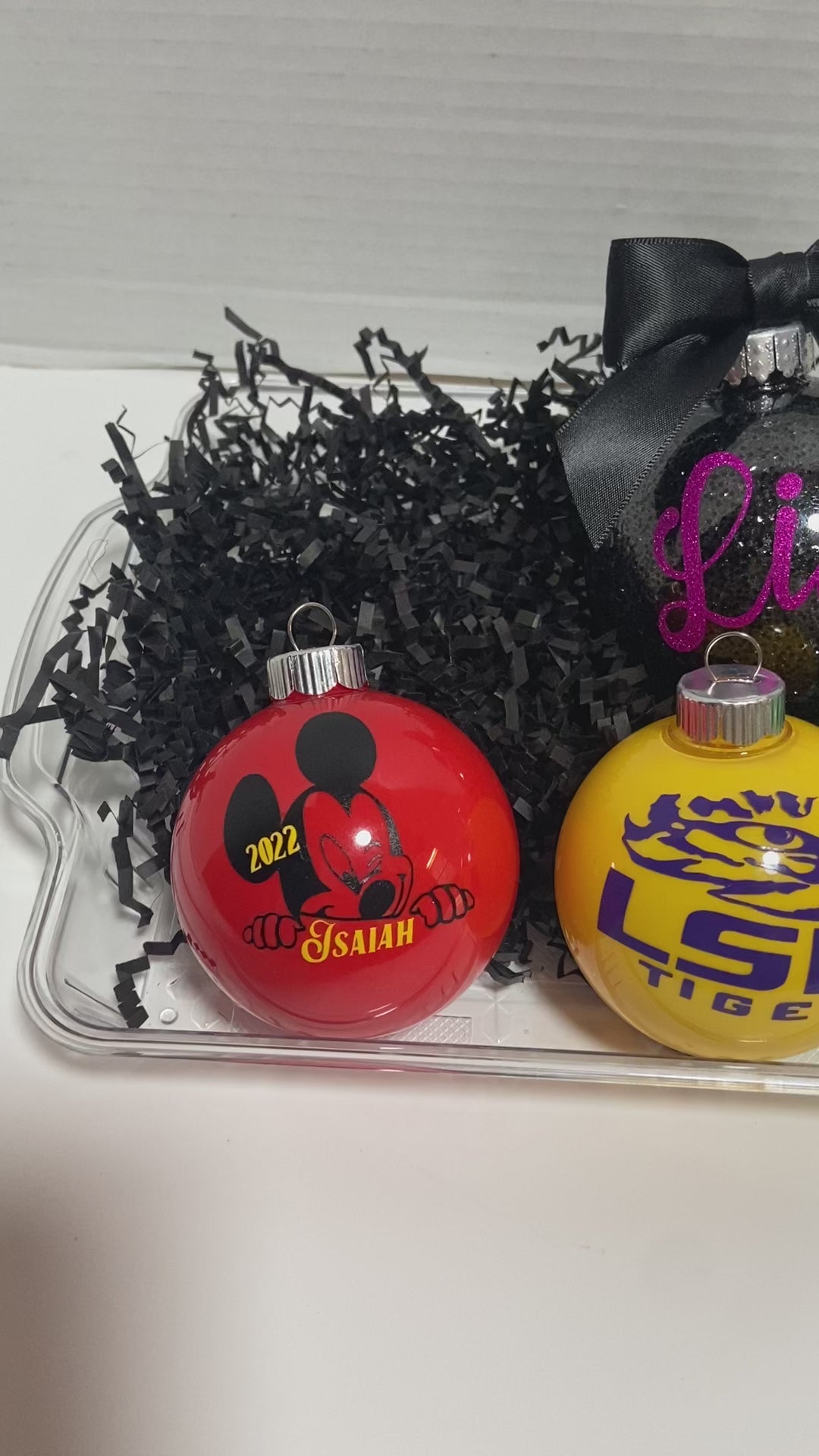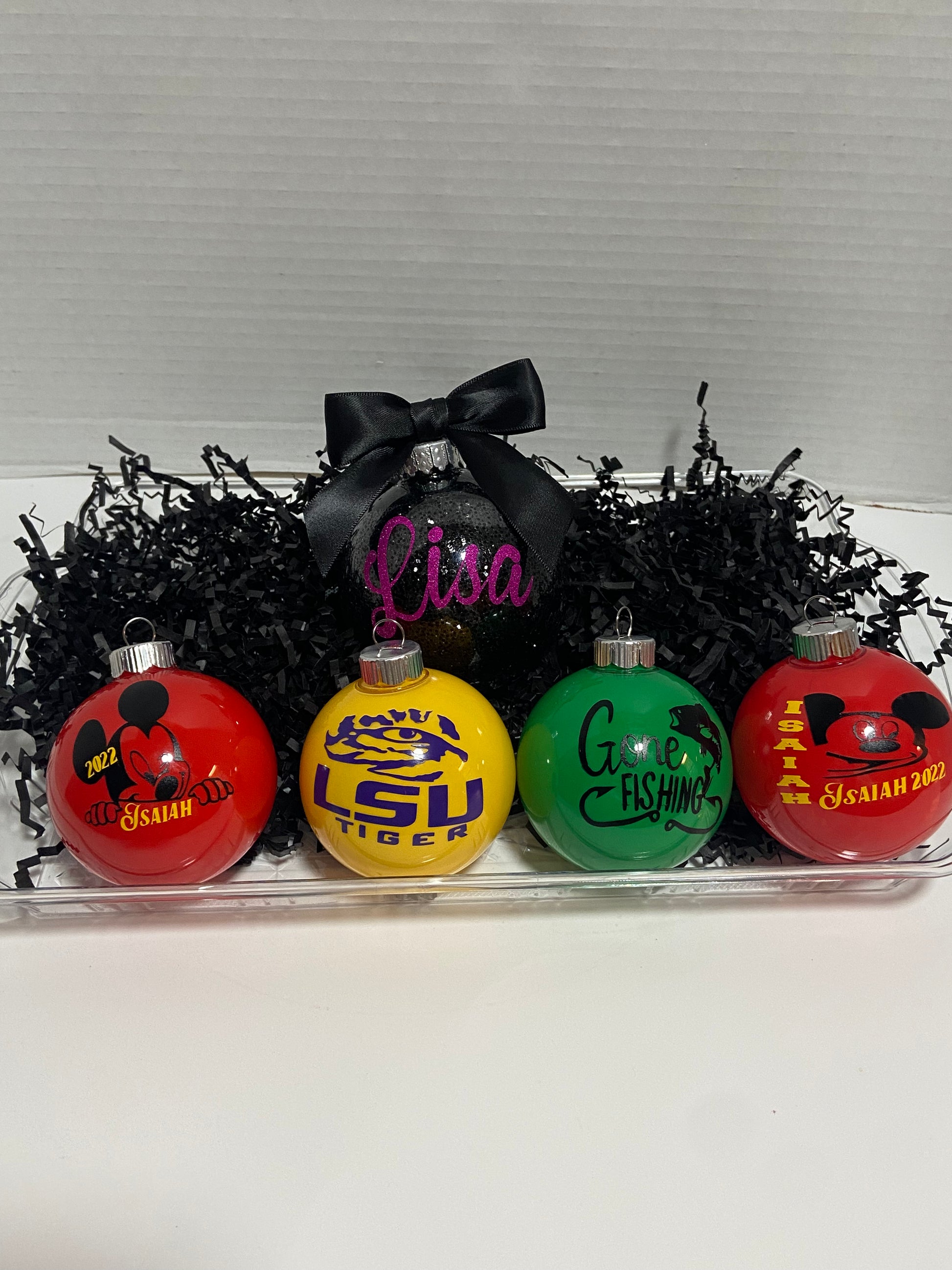 Plastic ornaments can be personalized with name, initial, character, and or bow. Additional fees may apply depending on the design, colors Etc.