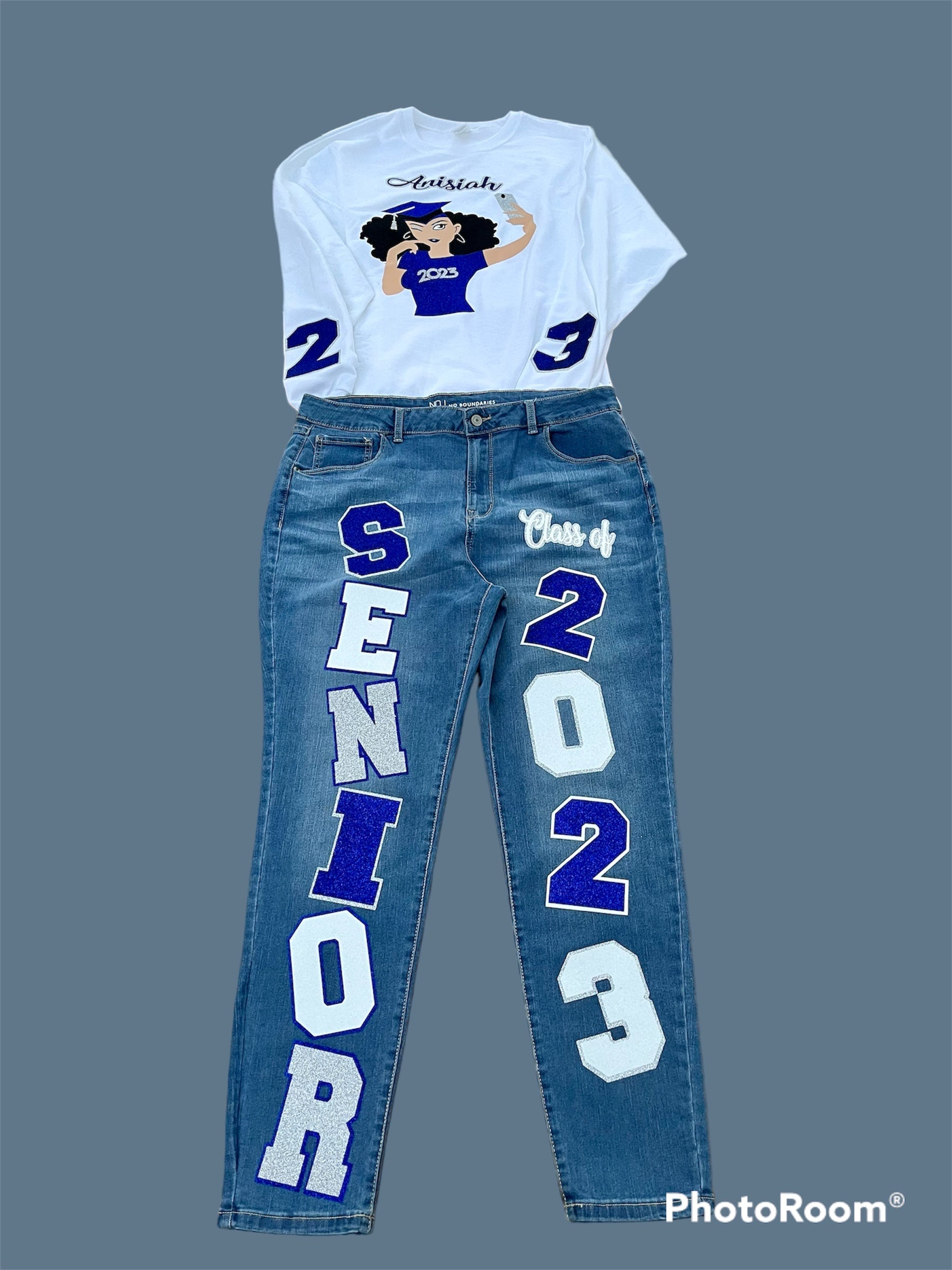Custom shirt and jean set. Any color any design of your choice. Relax fit jeans. Shirts are unisex t shirt style. If you do not see you size listed please let us know what size is needed. Jeans come in medium wash, dark wash, or black. If you desire a jean color that is not listed please specify in the description box. All sales are final. No refunds