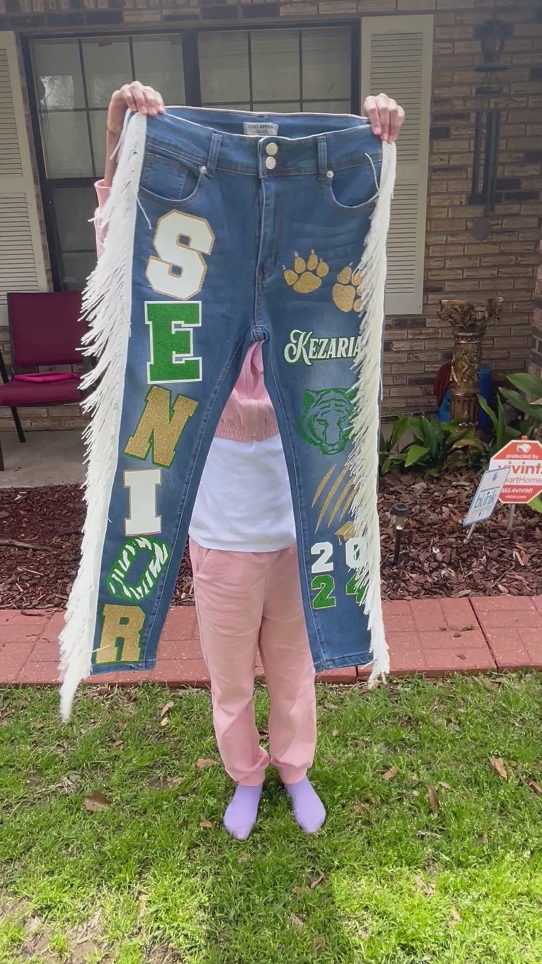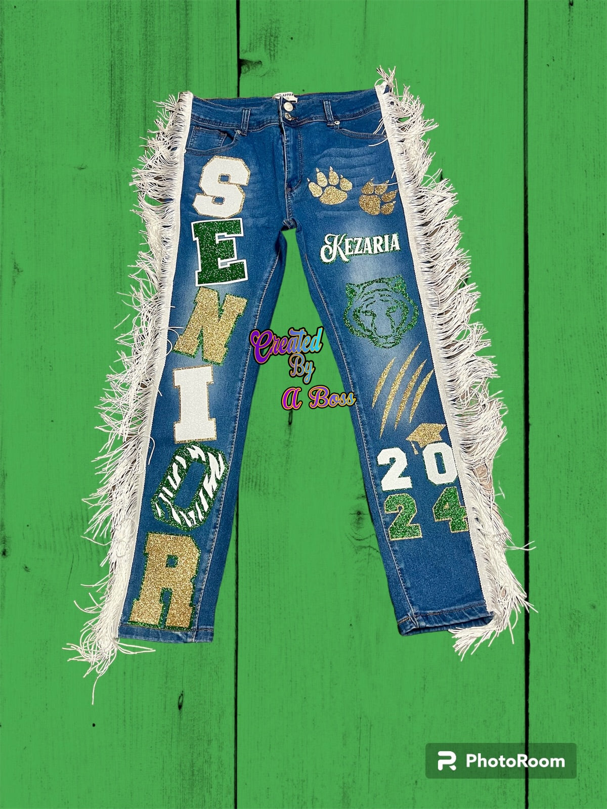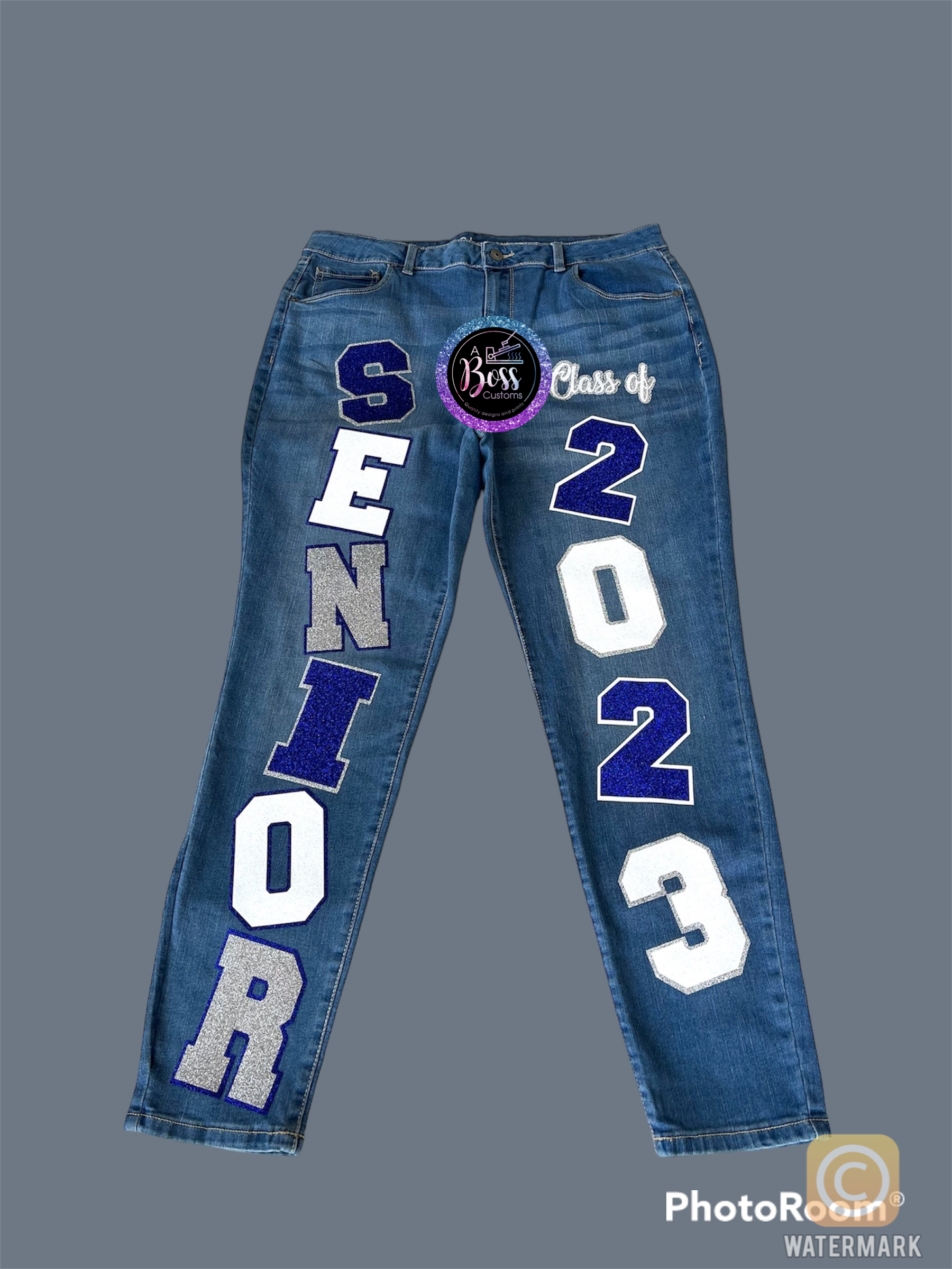 Jeans are designed front only. Relax fit jeans but more so skinny leg with some stretch. Jeans are customized with HTV (heat transfer vinyl) and or transfer image. Jeans can be customized in Any colors, wording, or design. If you desire a jean color that is not listed please specify in the description box. If your size is not listed please let us know. No refunds. All sales are final.